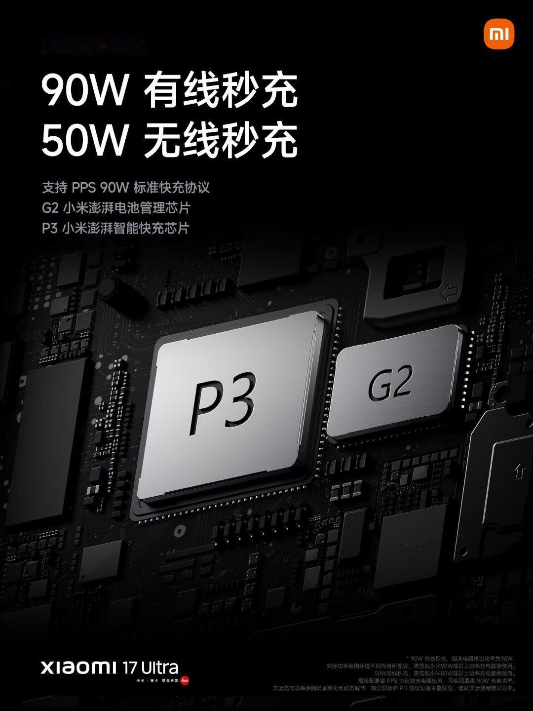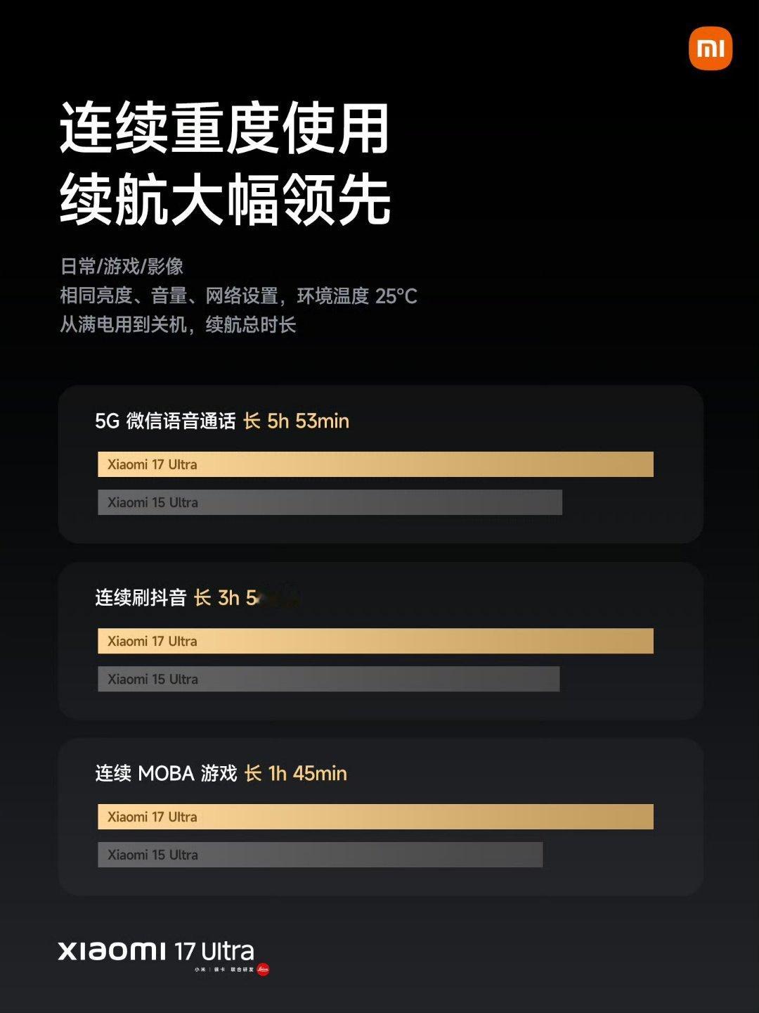 小米 17 Ultra 内置 6800mAh 小米金沙江电池(16% 硅含量,能量密度 882Wh/L),90W 快充,50W 无线快充,兼容 90W PPS 协议,澎湃 P3 快充芯片+澎湃 G2 电池管理芯片,UWB 天线,小米 T1 & T1P & T1S 信号增强芯片,51 个通信频段 小米17Ultra 巅峰科技旗舰,性能全面跃升。6.9英寸超窄四等边直屏,超低功耗、超清画质,第五代骁龙8至尊版,磅礴算力,能耗更低,双路立体环形冷泵,持续重载应用,依旧冷静,6800mAh小米金沙江电池,带来超强续航能力,还支持PPS通用快充协议,适配更多充电设备。小米17Ultra今日发布 小米发布会小米17Ultra小米17Ultra今日发布 ,