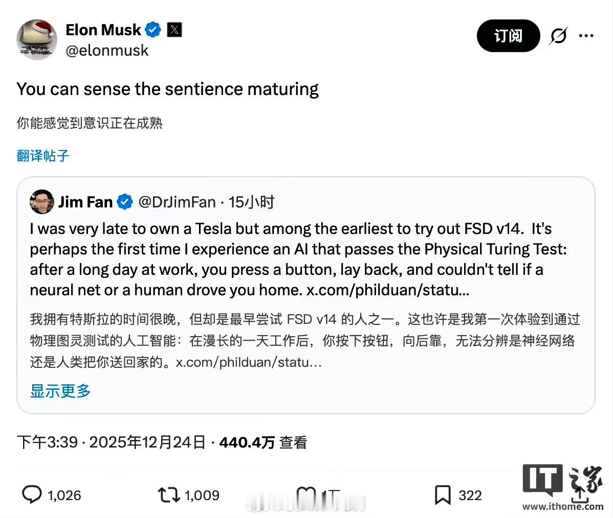 英伟达机器人负责人 Jim Fan 刚发话:特斯拉 FSD v14,已经通过了他的“物理图灵测试”!啥意思?就是这车开起来太像人了——变道、等灯、避让,自然得让你根本分不清是 AI 还是老司机在握方向盘。他亲测加班到半夜,按个键,车自己稳稳送你回家,全程几乎不用接管。 用几天就上瘾,不用反而浑身不自在,跟手机没电一个感觉。这不是炫技,是 AI 真正融入现实生活的开始。