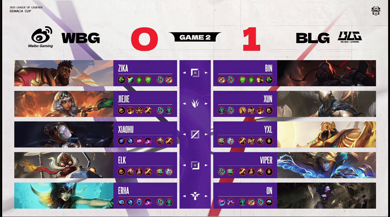 BLG选用:Bin塞恩;Xun潘森;Yxl沙皇;Viper伊泽瑞尔;ON牛头