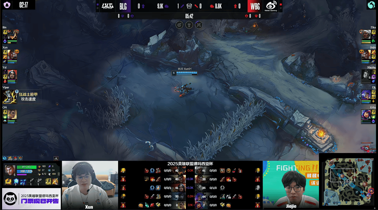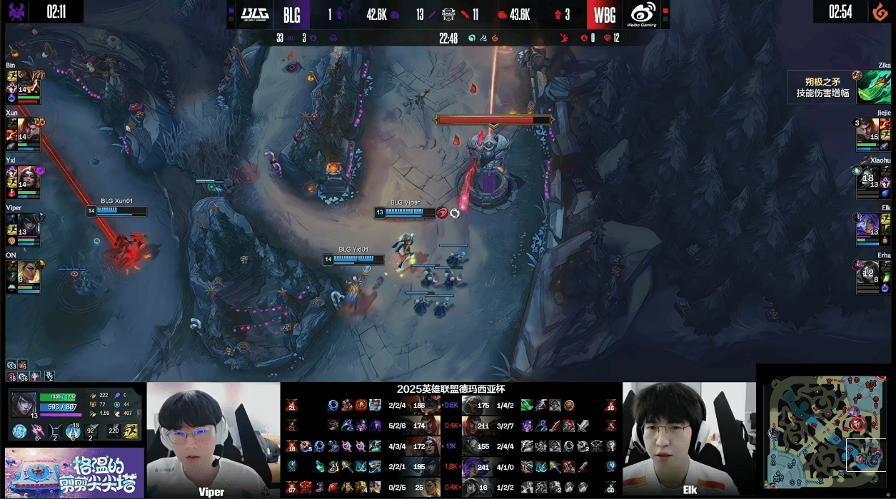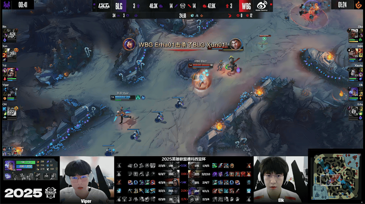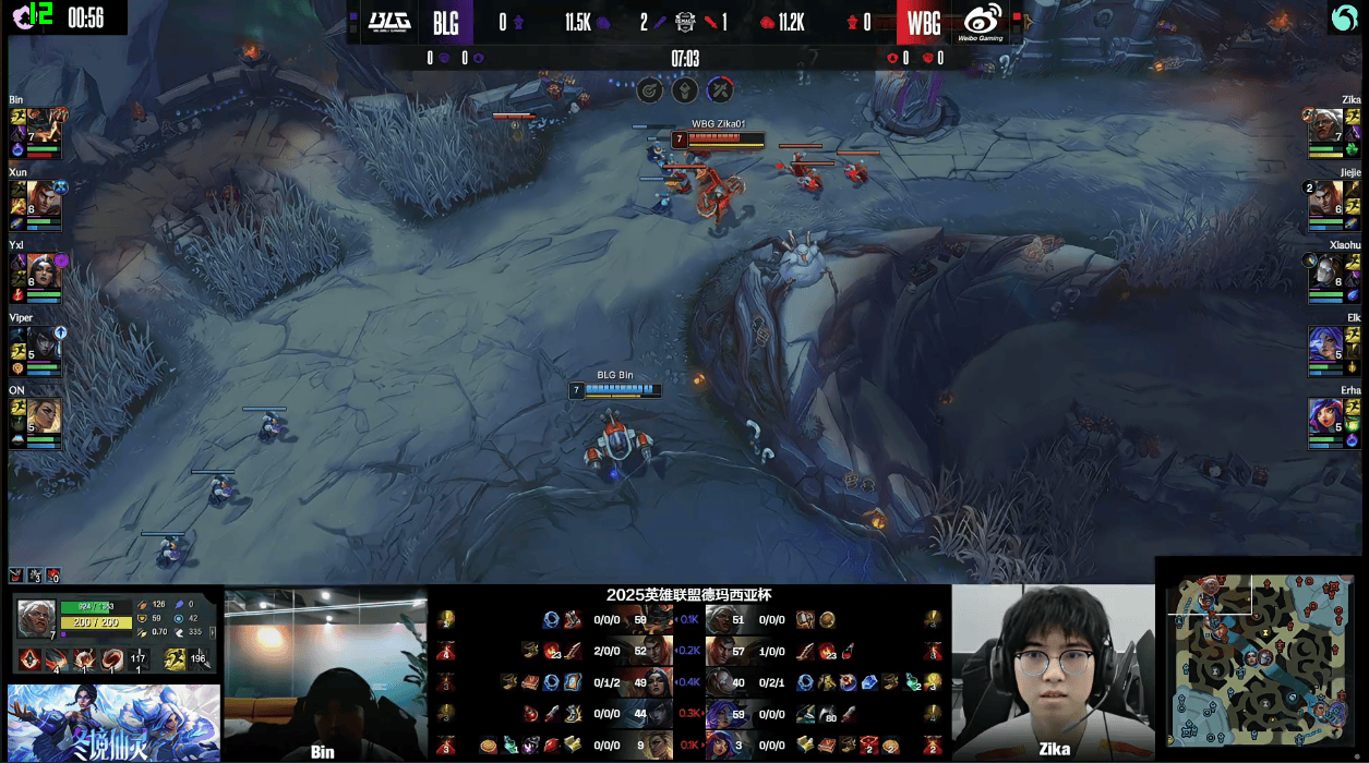 8分钟,WBG下路越塔Elk拿下双杀,随后BLG上路越塔击杀Zika