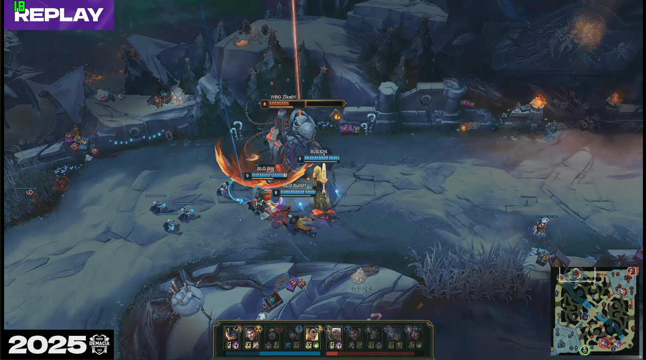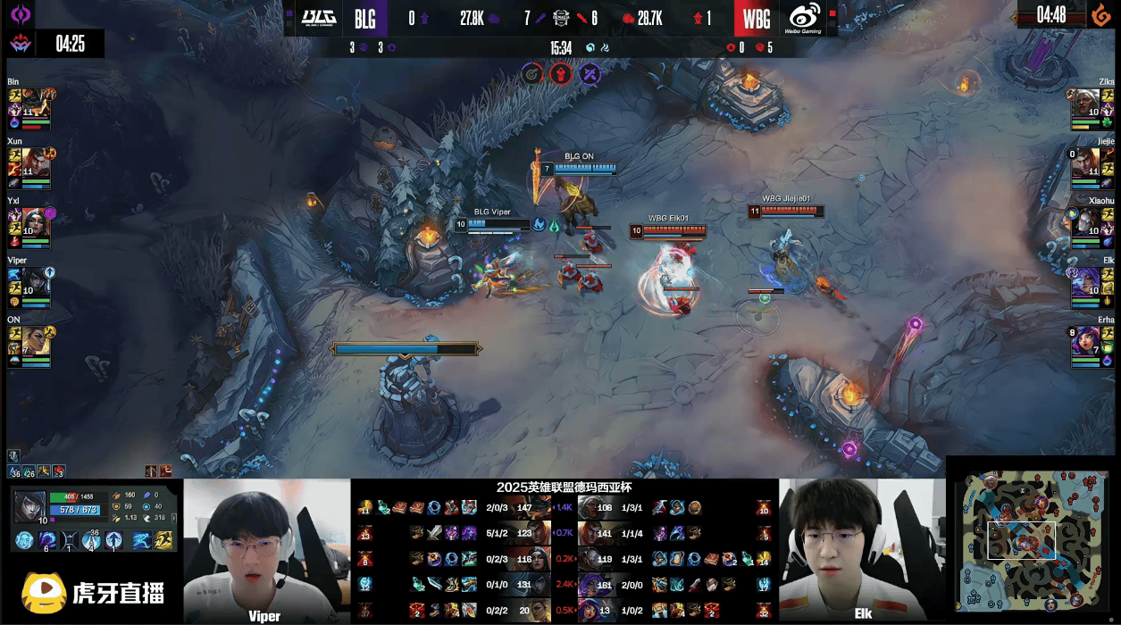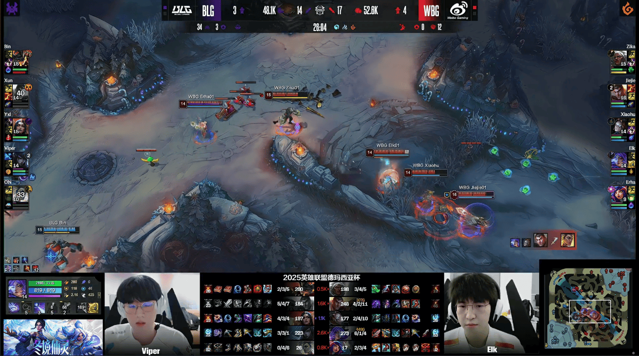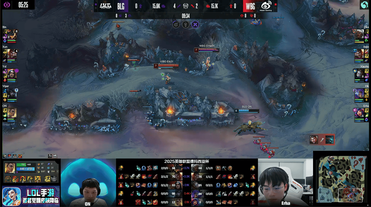 8分钟,WBG下路越塔Elk拿下双杀,随后BLG上路越塔击杀Zika