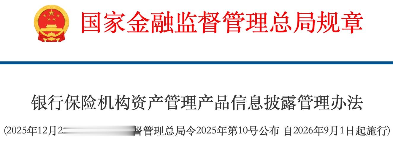12月25日,国家金融监管总局官网发布《银行保险机构资产管理产品信息披露管理办法》(简称《办法》),对三类产品的信息披露进行规范。2026年9月1日正式施行。