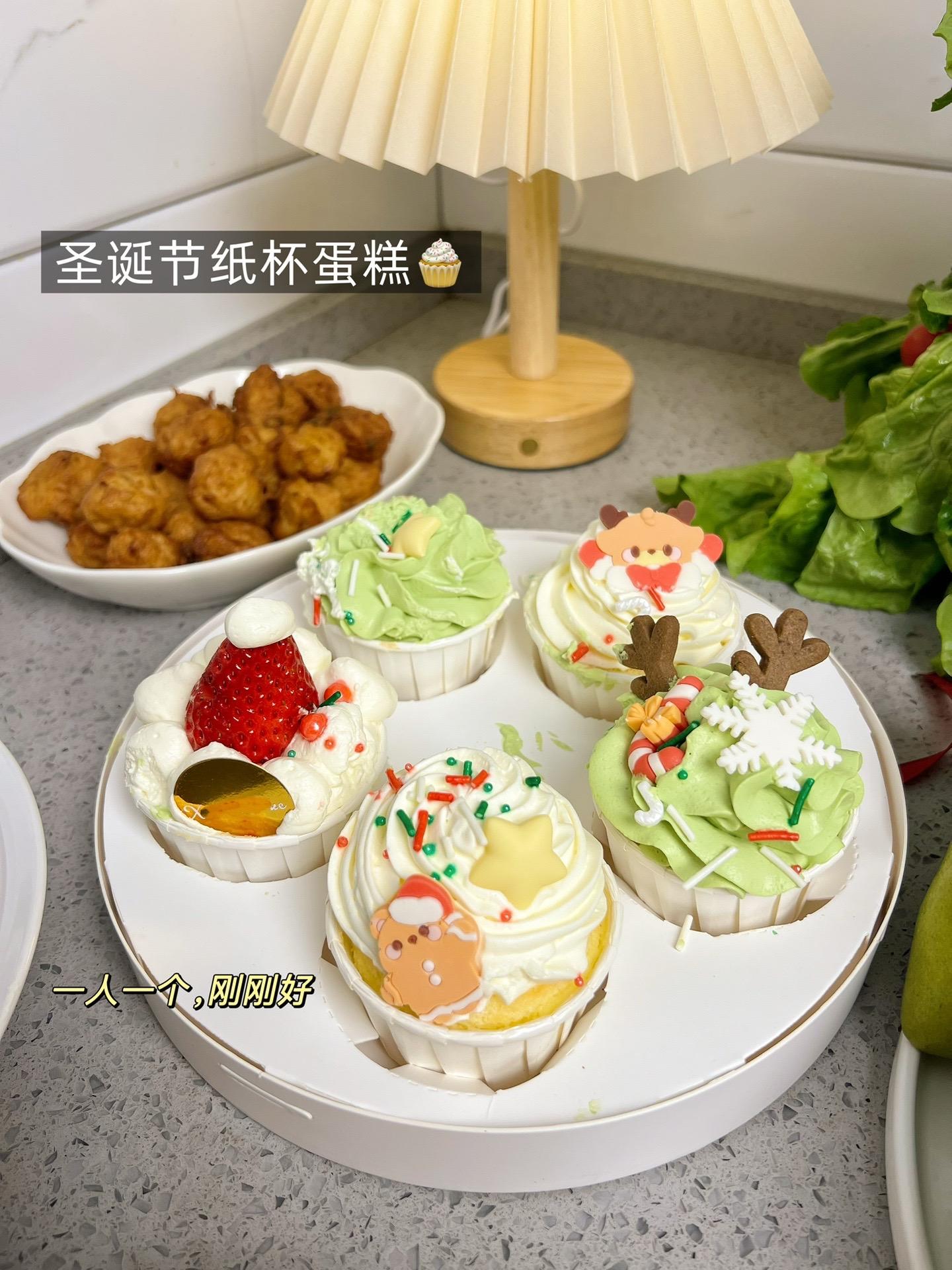 我下了班,带回一份圣诞主题的纸杯蛋糕。
