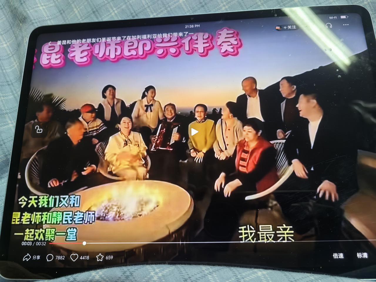 姜昆作为中国曾经的曲协主席,体系内的一级演员,德艺双馨艺术家。圣诞节在美国加州的