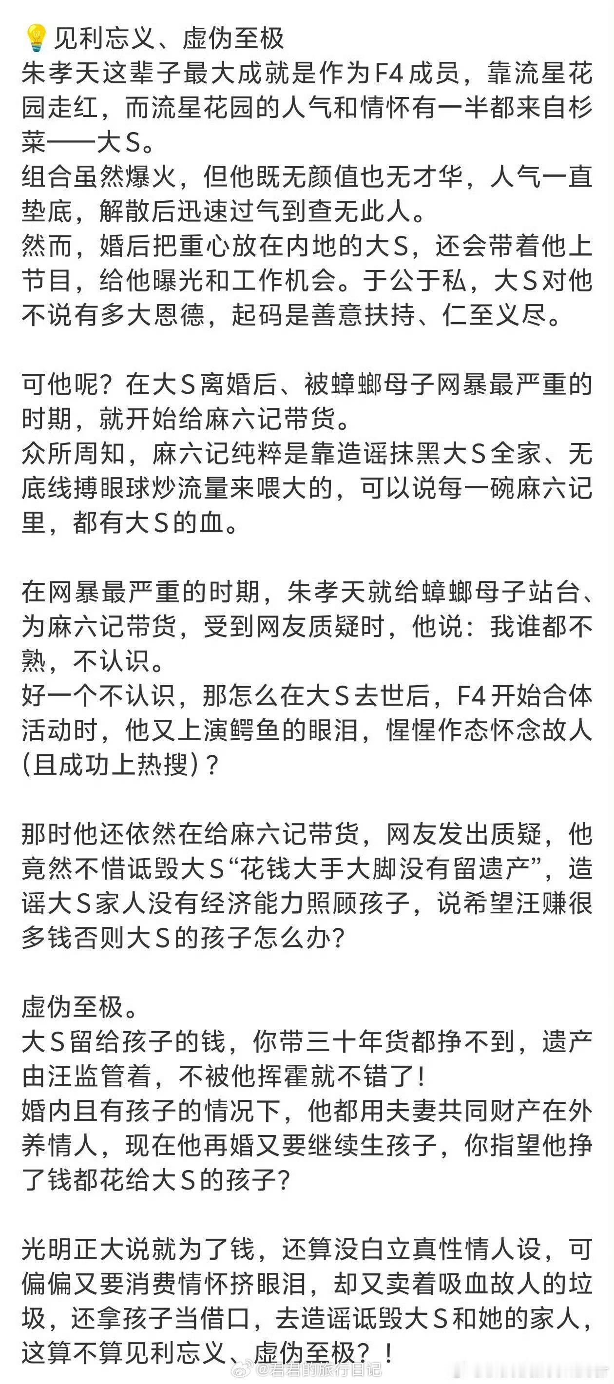 朱孝天说自己皇帝投胎 其实多看几段朱孝天以前的采访,就会发现这人仗糊行凶,靠碰瓷和造谣博关注。前嘴说的话后嘴就忘,每一个伸手表达善意的人,最后都会被他背刺
