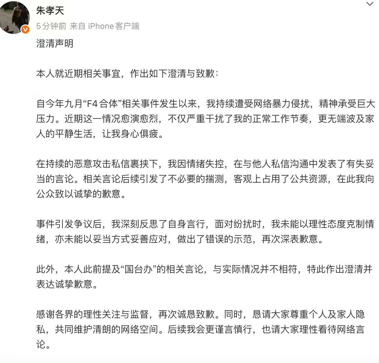 自今年九月“F4合体”相关事件发生以来,我持续遭受网络暴力侵扰,精神承受巨大压力。近期这一情况愈演愈烈,不仅严重干扰了我的正常工作节奏,更无端波及家人的平静生活,让我身心俱疲。