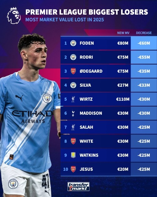 直播吧12月25日讯德国转会市场公布了新一期的球员身价情况,进入2025年后,英超多名球星身价出现大幅下跌。德国转会市场盘点了2025年英超球员身价下跌榜,曼城两将福登和罗德里分别下跌6000万欧元和5500万欧元位居前二。