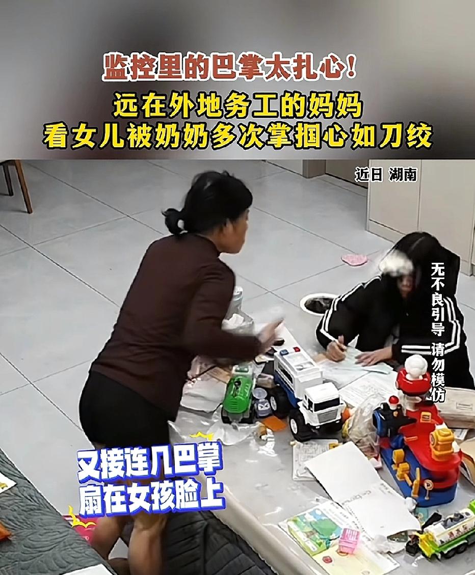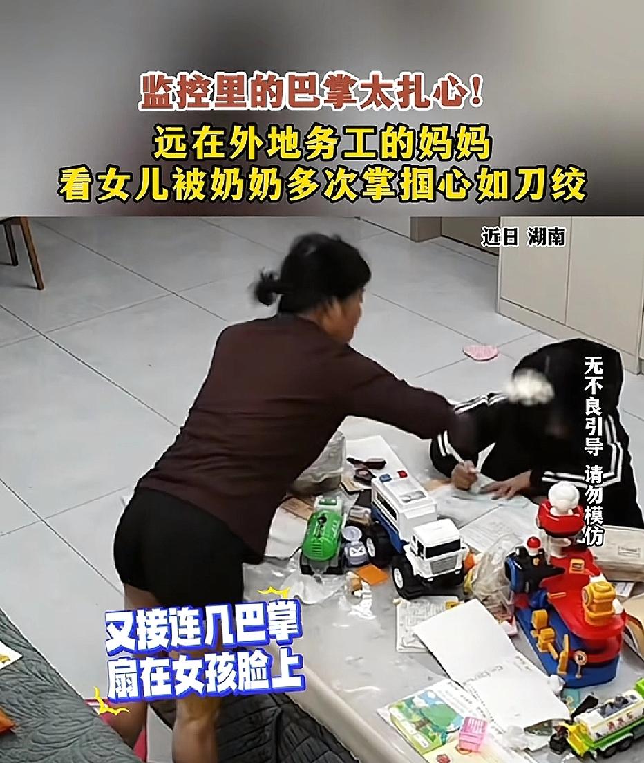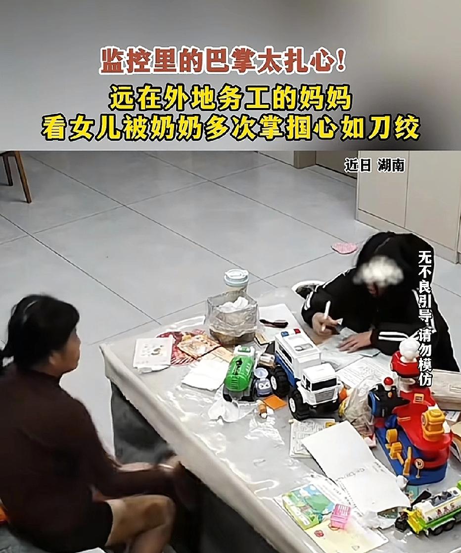 湖南,女孩是留守儿童,跟随奶奶在家。女孩趴在桌子上写作业,不小心睡着了,不料,奶奶看到了,竟然按住女孩头,一顿耳光扇过去。女孩被打得懵了,不敢反抗,她的父亲从监控看到这一幕,心都碎了,母亲也是哭了一夜。 老家的监控画面里,一声声巴掌响,把在外务工夫妻俩的心都震碎了。 丈夫攥着拳头,指节都白了,一整夜没吭一声,就那么瞪着屏幕,眼底全是红血丝。 妻子更别提了,眼泪就没停过,哭到后半夜,嗓子都哑了,捂着脸蹲在地上,连喘气都疼。 他俩为啥这么难受?还不是为了老家的闺女。 夫妻俩都是农村的,想给孩子挣学费,又要负担一家老小经济开支,只能咬牙背井离乡去城里打工。 闺女还小,上学离不开人,思来想去,只能把孩子留在老家,托付给奶奶照顾。 两人不放心孩子啊,俩人省吃俭用攒了点钱,给家里装了监控。 每天干完活,累得腰都直不起来,他俩第一件事就是掏手机看监控。 只要瞅见闺女趴在桌子上写作业,或者乖乖吃饭,浑身的累就都散了,那是他俩苦日子里唯一的甜。 出事这天,跟平常没啥两样。夫妻俩忙完活,习惯性点开监控,想看看闺女乖不乖。 画面里,闺女趴在书桌前,小脑袋一点一点的,估计是写作业太累,睡着了。 俩人还正心疼呢,念叨着孩子太辛苦了,等发工资了,就邮寄钱回家,给闺女买好吃的犒劳她。 就在两人感叹中,让人气愤的一幕发生了。 下一秒,奶奶推门进来了。 她看到孙女趴在桌上睡着,脸立马拉下来了。 她几步走到桌子前,一只手死死按住闺女的头,另一只手扬起来,对着闺女的脸就扇了过去。一下、两下、三下…… 闺女被打懵了,猛地惊醒,小身子吓得直哆嗦,眼里全是害怕,愣是一动不敢动,连哭都不敢哭出声。 这还没有结束,奶奶嘴里不停地嘟囔什么话。 而夫妻俩看着这一幕,当时就傻了。 他俩出来打工,天天累死累活,不就是想多挣点钱,让闺女吃好点、穿好点、将来能有出息吗? 可谁能想到,他们拼命护着的宝贝疙瘩,竟然在老家受这种委屈。 丈夫“腾”地一下站起来,一脚踹翻了旁边的小板凳。 他胸口气得鼓鼓的,愣是没喊出一声,就觉得心口像是被人用刀子剜,疼得喘不过气。 他怎么没想到自家老人这样对待闺女,孩子那么小,轻声细语教育一下就好了,怎么舍得下狠心去打她。 妻子的眼泪“唰”地就下来了,伸手想去摸屏幕里的闺女,嘴里反复念叨:我的娃呀,我的娃呀,早知道把你带在身边。 这件事传开后,网友们也炸开了锅。 有人说,老人带孩子观念太陈旧,总觉得“棍棒底下出孝子”,根本不懂这样的打骂会给孩子留下多大的心理阴影。 留守儿童的问题不是单一家庭的问题,父母在外打工也是无奈之举,只怪生活太难,谁都不想骨肉分离。 也有人叹气,装监控本来是想多看看孩子,没想到却看到了最扎心的一幕,这对父母得有多后悔。 奶奶的行为是违法的。 《未成年人保护法》第17条规定,未成年人的父母或者其他监护人不得实施虐待、遗弃、非法送养未成年人或者对未成年人实施家庭暴力 。 奶奶按住女孩头部扇耳光的行为,并非合理的家庭教育方式,而是典型的家庭暴力。 儿子儿媳看到了,也要制止,可以教育老人不该这样对待孩子,有话好好说,要用文明的方式教育。 《反家庭暴力法》第12条规定,未成年人的监护人应当以文明的方式进行家庭教育,依法履行监护和教育职责,不得实施家庭暴力 。 奶奶本是女孩留守在家的主要依靠,可突如其来的殴打,会让女孩觉得最亲近的人也充满危险。 这样是不利于女孩身心健康的。 真正的家庭教育,从来不是靠拳头和巴掌立规矩,而是靠爱与耐心的滋养,让孩子知道自己是被偏爱的,才会有勇气去面对成长里的风风雨雨。 对此,你怎么看?