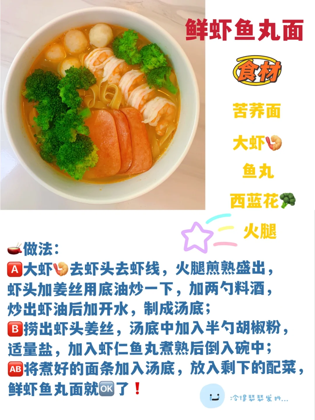 🆎将煮好的面条加入汤底,放入剩下的配菜,鲜虾鱼丸面就🆗了❗