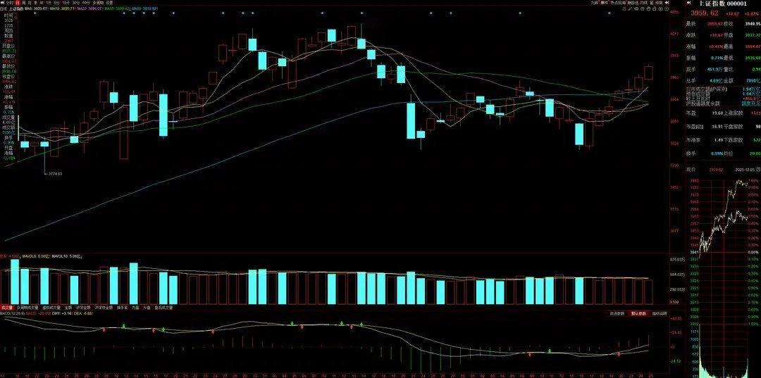12月26日A股策略:警惕!两路主力追高意愿下降!8连阳有点悬!专注A股市场每日实战操作,让散户投资不迷路!如果你不是长线投资者,想在A股市场中活下来,那么必须明白:周密的布局计划只能保证一个好的开始,严格的操盘纪律才能结出丰硕的果实!一、大势研判:7连阳后存震荡需求,箱体格局未改周四A股大盘小幅放量上涨,成交量增加460亿至1.94万亿。从技术形态来看,短期大盘走出7连阳强势走势,始终站稳5日线,维持单边上行趋势。只要5日线与10日线不失守,短期上行结构就不会松动。不过需要警惕的是,周四收盘点位小幅偏离5日线,存在超买迹象,因此周五出现小幅震荡的概率有所增加。从中期视角来看,大盘仍处于高位大级别箱体震荡区间,箱体下沿支撑位在3800点,上沿压力位在4000点。结合近期市场节奏判断,1月之前大盘延续强势的概率更高,大级别震荡调整或将于1月之后开启。二、盘面跟踪:热点轮动有序,赚钱效应延续周四沪深两市个股涨多跌少,上涨家数达3700只,下跌家数1400只,市场赚钱效应进一步凸显。从板块表现来看,人民币升值概念下的造纸板块领涨两市,不过盘后交易数据暂未发现机构资金进场痕迹;商业航天相关板块延续强势表现,航空发动机、卫星导航、军工电子等细分方向涨幅居前;机器人、低空经济等科技板块同步迎来补涨加速。跌幅榜上,顺周期板块与海南本地股表现低迷,贵金属领跌,能源金属、有色金属等板块走势疲软。主线热点方面,海南自贸区与锂电池板块逆势调整,其余热点均随盘走强,其中商业航天、可控核聚变板块涨幅居前,整体市场格局较为健康。三、消息面跟踪:多重利好落地,关注政策催化1. 商务部回应是否放松对美稀土磁体出口限制时表示,中方始终致力于维护全球产业链供应链安全稳定,积极促进、便利合规贸易。2. 上海市印发《关于支持长三角G60科创走廊策源地建设的若干措施》,围绕共筑科技创新策源地、共建世界级产业集群、共育国际一流创新生态、共享科技创新资源四大方向,提出23条支持政策。3. 12月25日,离岸人民币对美元汇率升破“7”关口,这是去年10月以来离岸人民币汇率首次收复这一重要整数关口。四、市场资金面:两路主力追高意愿降温,主线暂未切换周四机构与游资操作方向呈现一致性特征:机构买盘幅度明显萎缩,卖盘小幅增加,资金流向从大幅净流入转为小幅净流入;游资买盘同样小幅收缩,卖盘微幅释放,资金状态从小幅净流入转为持平。从板块资金流向来看,机构与游资操作存在分歧:机构大幅加仓商业航天板块,游资则对该板块小幅减仓。其他主线热点方面,机构加仓可控核聚变、存储芯片及海南本地股,同步减仓锂电池;游资则加仓锂电池,减仓可控核聚变与CPO。整体来看,由于机构与游资均未向其他方向进行大幅调仓,市场主线热点暂时不会发生切换。