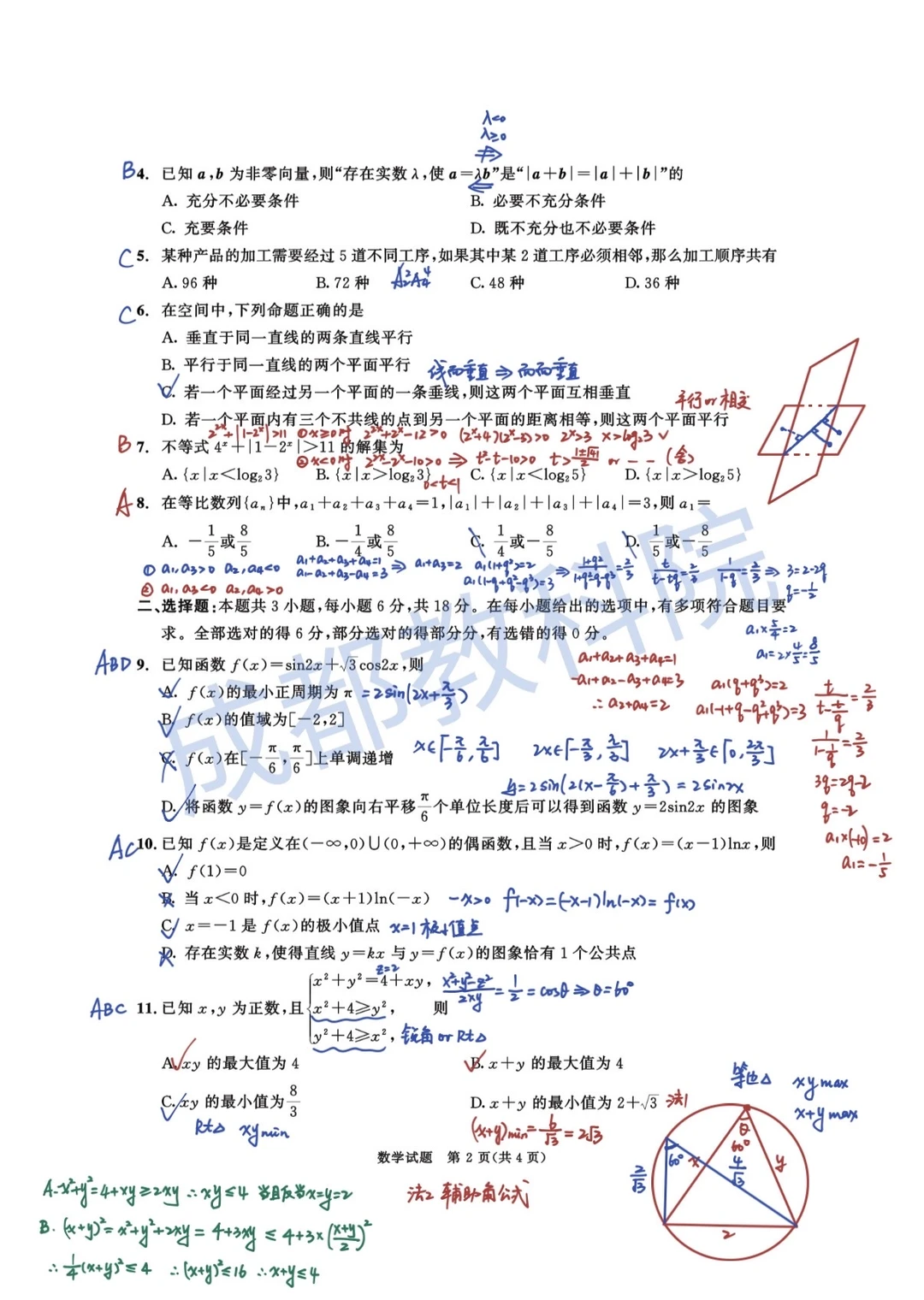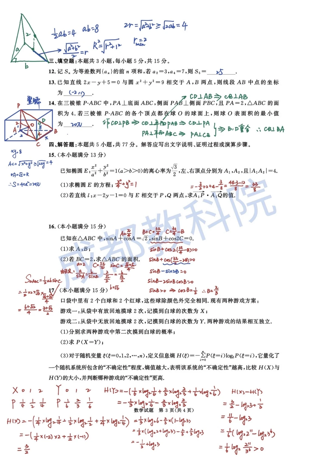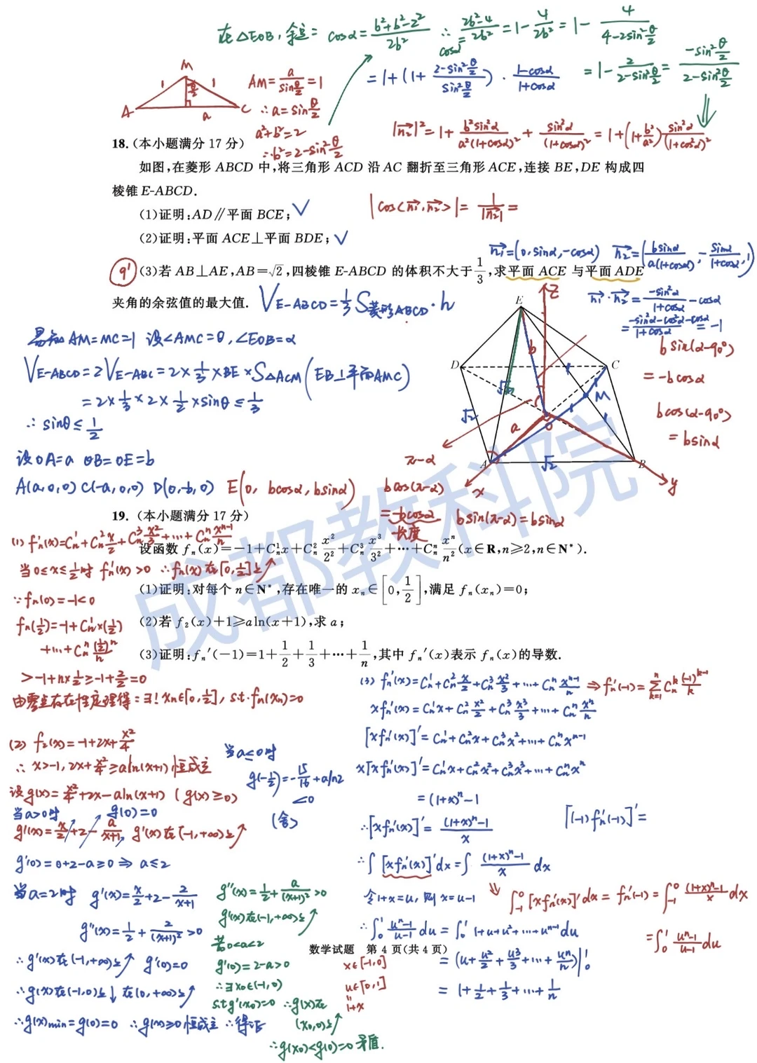 18题第3小问我处于放弃状态,确实没想到好的方法,未知量设的太多,最后参考答案方法,也快算吐了。想征集大家18题好的解法。 11题用了特殊三角形秒,方法也很多。19题第3小问用了积分,所以我觉得还好,高中方法要用到组合数公式去算,计算量大。14题较温柔,鳖臑的外接球。10题的D选项容易错选。其他题我觉得比较常规,也容易得分。