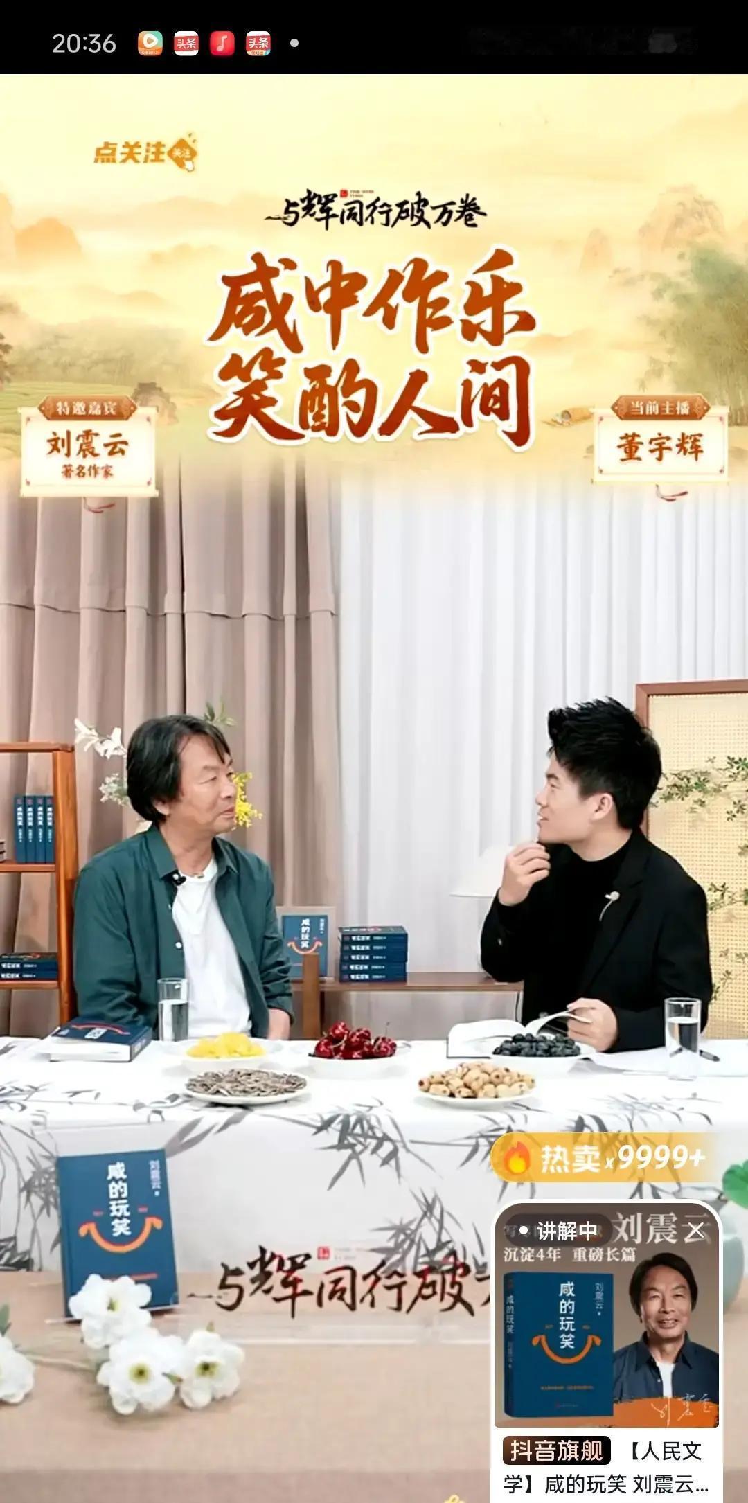 刘震云在直播间卖了五万本书,但没提一句文学。 他笑着对董宇辉说:“我老家延津,人饿了吃土,是真的吃。” 这句话,比他所有小说都狠。八百万人瞬间被钉在屏幕前。 你看他拆解《咸的玩笑》:一个农民,因为一句玩笑被追了半辈子。这不是故事,是1942年延津人用荒诞对抗饥饿的生存密码。他把苦难熬成了幽默,把泥土变成了黄金。 数据很冷:58%的观众是30-45岁的女性。她们买的不是书,是深夜孩子睡后,那十五分钟属于自己的“呼吸权”。刘震云给了她们一个高级的借口——我在进行文学消费。 于是,延津县的文旅地图连夜改了。教堂、老站台、吃土的那片河滩,全成了打卡点。文学从纸上站起来,走进了高铁票和酒店订单里。 最后他也没推销。只是眯着眼,像讲邻居八卦:“人这一辈子,其实就活个两三句话。” 评论区安静了五秒,然后库存清空。 顶级作家降维直播,从来不是卖货。他戳破了一个真相:中产的精神饥渴,比胃更迫切。他卖的不是书,是一个能放进客厅的文学现场。