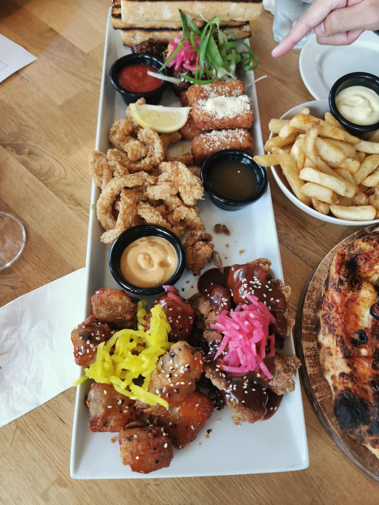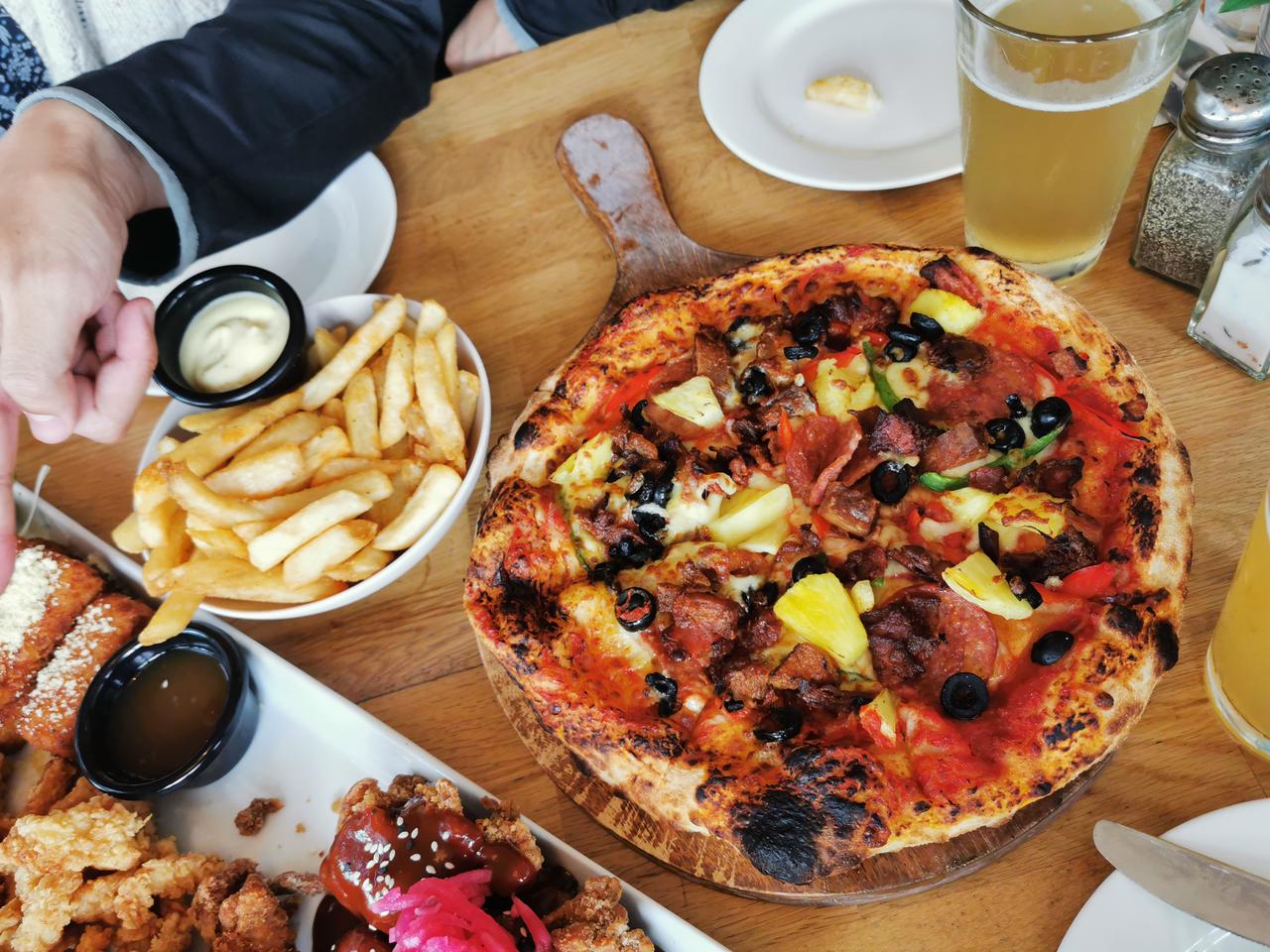 就这么一桌纯正的西餐——三个盘子,其中一个披萨,一盘土豆条,另一个盘子里是六道菜:烤猪肉、炸鸡、鱿鱼丝、炸奶酪、烤菜花和烤面包。当然还有两杯啤酒、一杯鸡尾酒和一杯果汁饮料,四人享用还剩了不少。价格嘛,160纽币,折合人民币650块,人均160块人民币左右。你看,值吗? 坐标:奥克兰