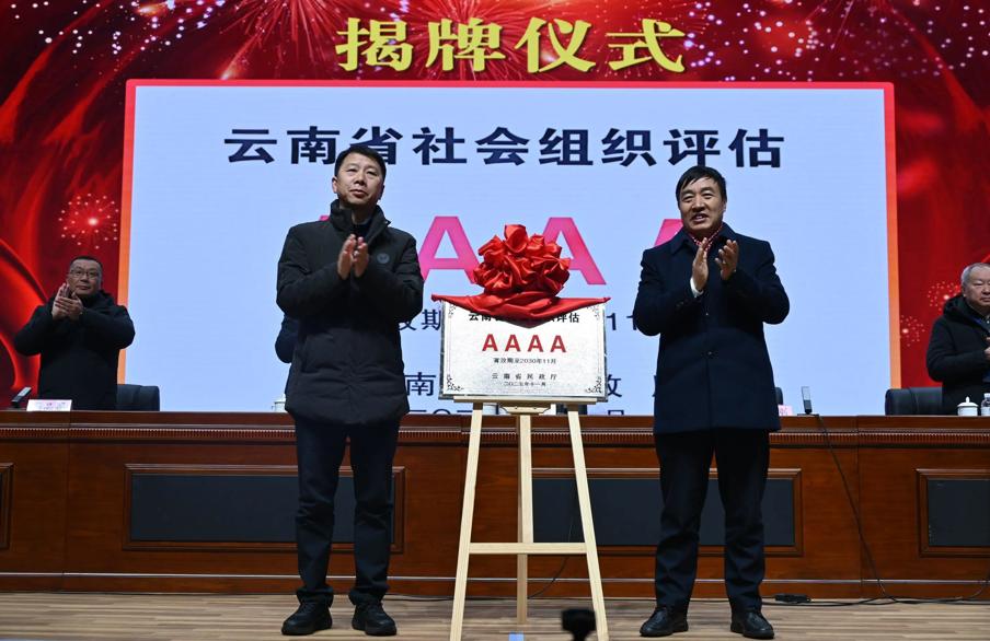 会上发布学会通过省民政厅 4A 级社会组织评估喜讯。云南省教育厅职业与成人教育处副处长、学会副会长胡正刚与学会会长刘伟共同揭牌。