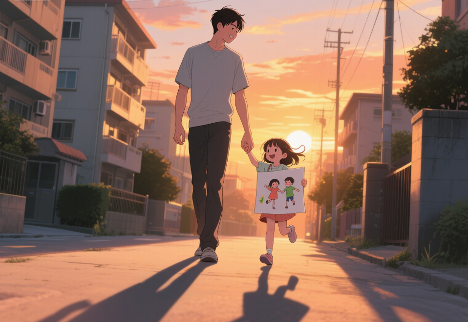 她从书包里拿出画,递给我。画纸上,有两个歪歪扭扭的小人,一个高一点,一个矮一点,高一点的小人手里牵着矮一点的小人,旁边还画了一个大大的太阳。我看着画,心里暖暖的 —— 这就是我想要的生活,简单、温暖、幸福。