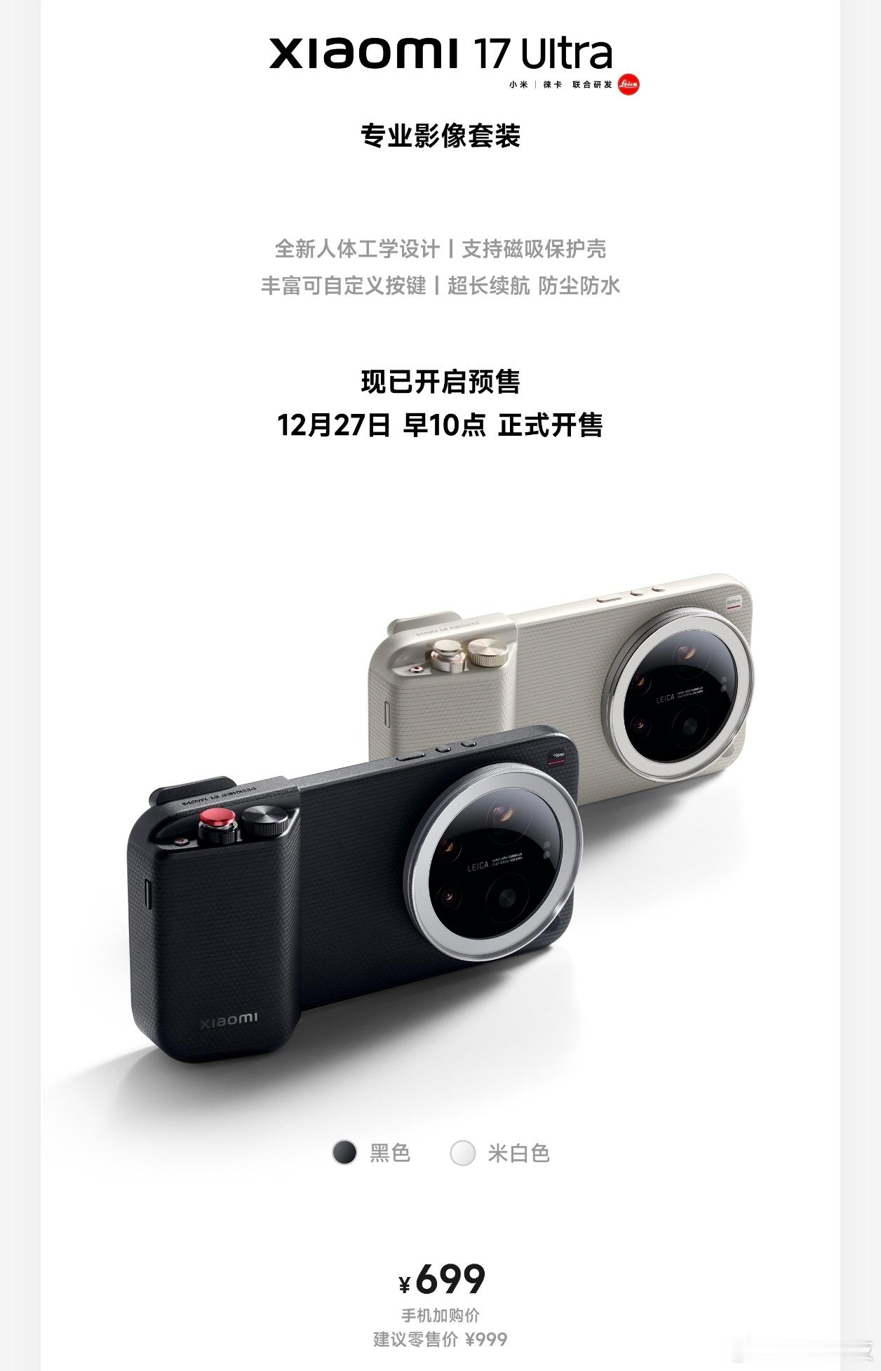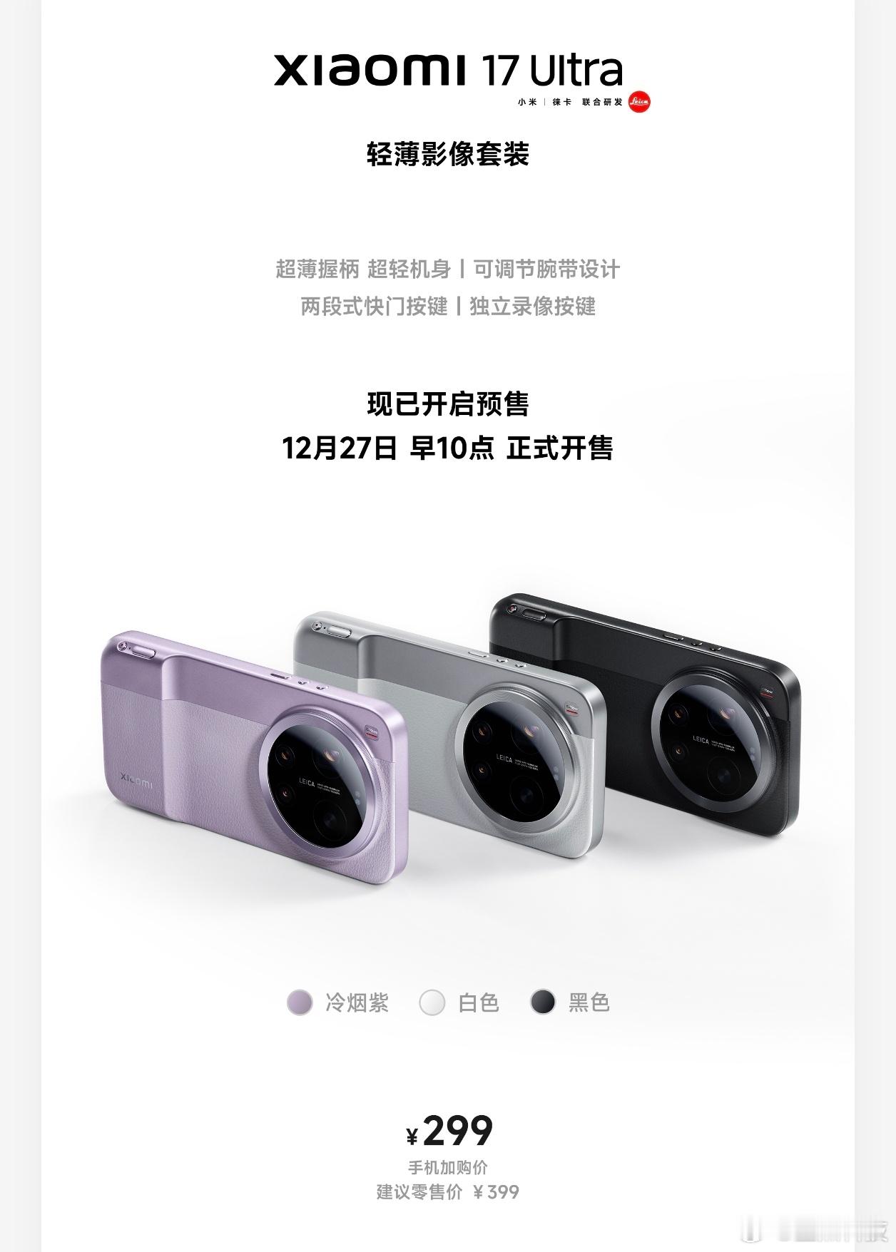 小米这也太拼了,小米17Ultra徕卡版不仅拥有徕卡经典红标、大师变焦环、徕卡专属画质、中框精雕滚花、篆刻徕卡铭文,还配备徕卡影像镜头组合,这个徕卡纯度如何?!而且,如果你想更专业,那你还可以选配专业影像套装以及轻薄影像套装,看了下价格还是比较良心,299起步!!小米17ultra徕卡版售罄 7999零售价首批抢到没