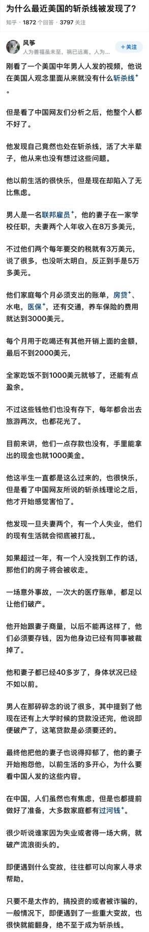 美国的“斩杀线”大家有了解过吗? 之前我也写过一篇相关文章,如果不了解的朋友可以真正深入的了解下美国的所谓“斩杀线”。 它没有实质,却真实存在,很多上半年还是社会精英,下半年只能流浪街头,或等待死亡。 也很好奇,以前那么多研究美国的学者,难道没有看出来吗?为啥他们避而不谈?谈的更多的却是美国社会的精致和自由?其实这些人骨子里就是真正的坏,把美国包装成了自由、民主和平等,忽悠了多少学子出国留学,导致多少家庭支离破碎? 其实我强烈建议,我们的教材要把这部分加进去,让孩子们更多了解这方面的知识,一旦深入了解,马上就会意识到我们社会主义的优越性,而不是以前所学的枯燥的理论知识。