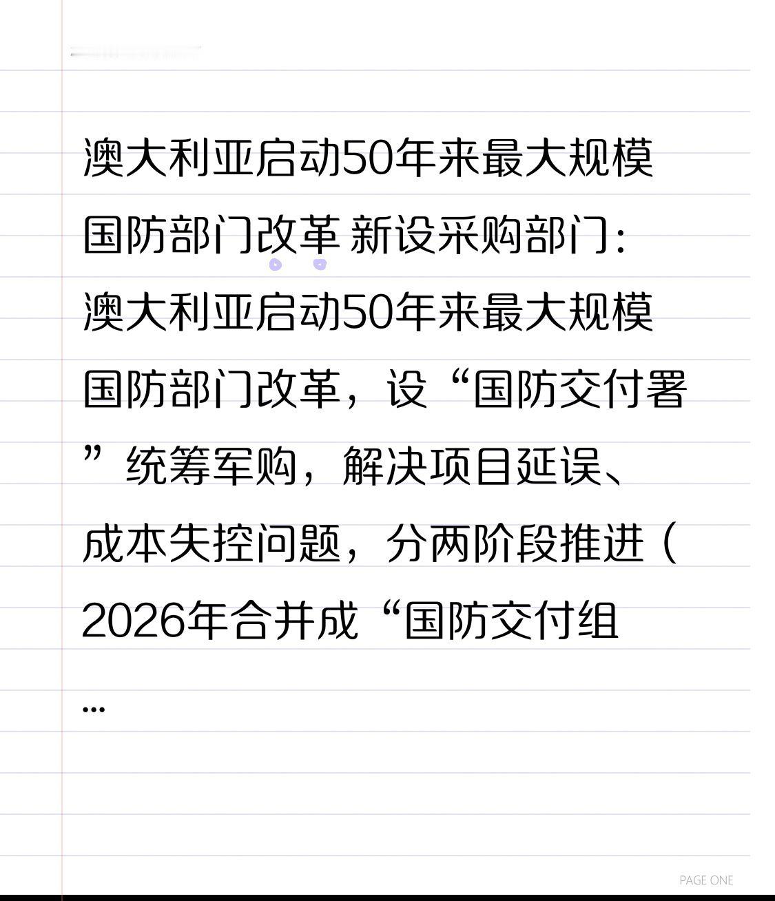 澳大利亚启动50年来最大规模国防部门改革 新设采购部门:澳大利亚启动50年来最大规模国防部门改革,设“国防交付署”统筹军购,解决项目延误、成本失控问题,分两阶段推进(2026年合并成“国防交付组”,2027年升格独立机构),含竞争性评估、红黄牌预警等机制;动因涉及军购乱象和“奥库斯”布局,同步增加国防预算至2034年达1000亿澳元,各界反应不一。