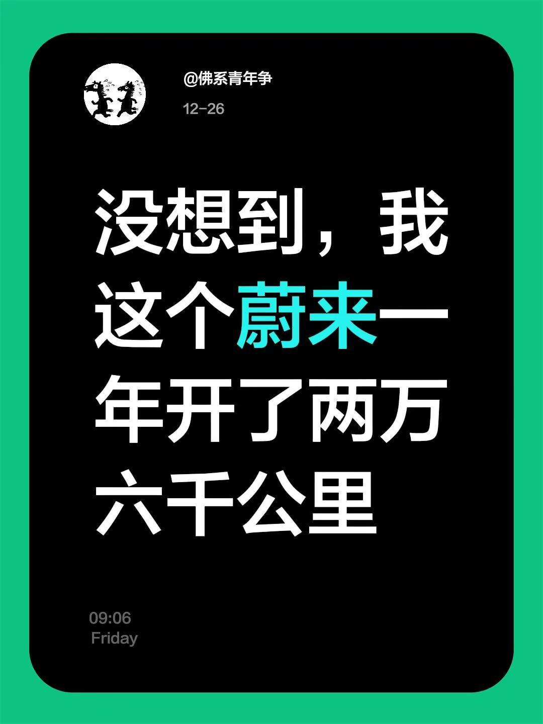 没想到,一年开了两万六千公里。没想到,我这个蔚来一年开了两万六千公里感叹时间过得快。开蔚来ES6一年跑了26000多公里,车子买了两年零两个月,一共现在是51900公里,2025一年跑了一半里程。原来油车开了7年半,跑了95000公里。我这车平均下来一公里大概1毛钱电费,基本上都是北京市内的通勤,补能也是家充为主,出过十次以内的短途,出城的补能方式就是靠换电了,因为都是出差,时间比较紧,换电比较方便,我也觉得这是对电池的检查换回来的电池在正常市区内使用,没有太多的续航差异感觉。保养方面就是正常购买1399那个服务包,被剐蹭了两次,正好把7天代步车积分拿回来了,也没用送的5张券,积分回本7*1500+2500=13000分,算上处理异响维保的时候的洗车+充电到80%,基本上这个花费持平保险费用在4500块钱。实际支出在4500+2600=7100块钱的水平,超不过8000元。如果同样使用频率下,确实比之前开油车省了钱的。我不去考虑保值这个维度,消费品没有保值的,何况30来万的电车。开就完了,多开多省。开的少,我也不建议买新电车。蔚来 蔚来es6