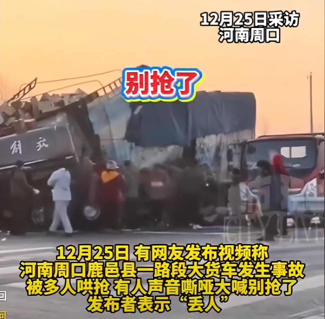 事故现场的笑声,是扇向道德的耳光!鹿邑这场趁火打劫的闹剧,看得人血压直飙,更寒了心。 12 月 25 日清晨,鹿邑一路口突发意外,大货车失控侧翻,车头撞得变形,满车零食散落满地。车主刚从驾驶室爬出来,周边中老年人已蜂拥而上。有人拎编织袋疯装,有人抱满零食狂奔,甚至打电话喊家人来 “分货”,脸上的笑容刺得人眼睛疼。 车主急得嗓子喊哑,一遍遍嘶吼 “别抢了”,可哄抢声盖过了哀求。他孤身面对几十号人,怕冲突出事不敢拦,只能眼睁睁看着货物被搬空,最后瘫坐在地,拍摄者李先生说那模样满是绝望。 直到交警赶到,哄抢者才慢悠悠散去。致电 110,只换来 “不便透露” 的敷衍回应。这不是地域之过,是少数人贪念作祟,抱着 “法不责众” 的侥幸。 《治安管理处罚法》早有规定,哄抢轻则拘留罚款,重则坐牢。小便宜占的是脸面,失的是人心。别让 “法不责众” 成遮羞布,严惩才能守住人性底线! 希望这起事件能有下文,别再不了了之,给车主一个公道,也给歪风邪气一记重拳!