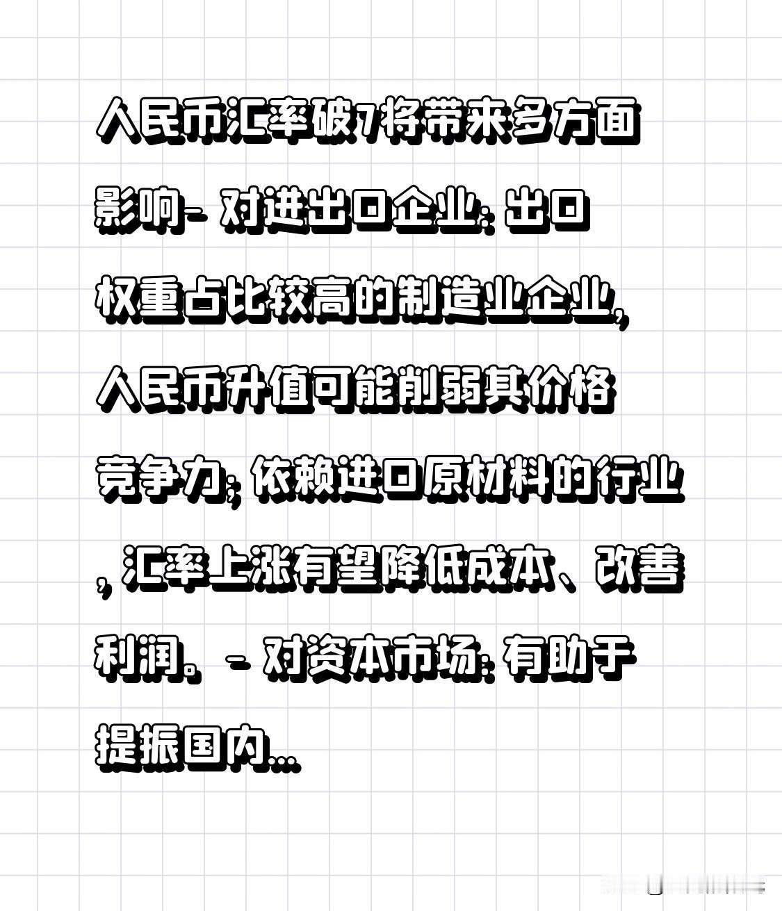 人民币汇率破7将带来多方面影响 - 对进出口企业:出口权重占比较高的制造业企业,人民币升值可能削弱其价格竞争力;依赖进口原材料的行业,汇率上涨有望降低成本、改善利润。 - 对资本市场:有助于提振国内资本市场信心,增大对资金的吸引力,提升人民币计价资产吸引力,打开货币宽松空间;但可能增加跨境投资的换汇成本,如港股通、互认基金等资金跨境投资,持股期间人民币汇率升值,最终收益率可能会打折扣。 - 对消费者:人民币升值直接提升购买力,进口商品成本下降,留学、海外旅游、海外购物等成本随之下降。