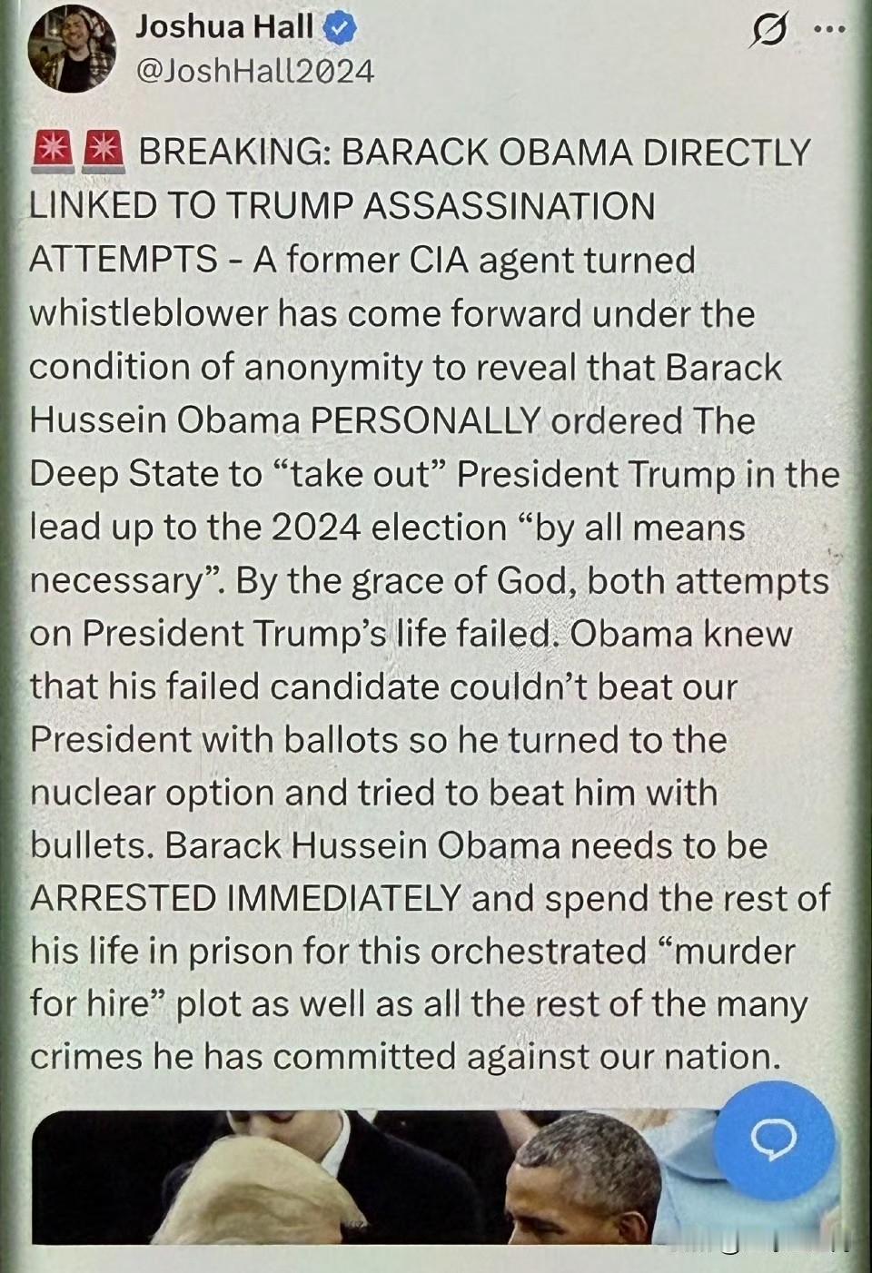 炸裂突发消息:奥巴马被指与针对特朗普的暗杀企图存在直接关联! 一名叛变为举报人的前中央情报局特工,在匿名条件下出面爆料称,贝拉克·侯赛因·奥巴马曾亲自下令“深层政府”,在2024年大选前夕“不择手段”除掉特朗普总统。幸得上天庇佑,针对特朗普总统的两次暗杀企图均以失败告终。奥巴马清楚,己方候选人无力通过选票战胜总统,便采取了极端手段,妄图用子弹终结竞选。贝拉克·侯赛因·奥巴马必须立即被捕,因其策划这场“买凶杀人”阴谋,以及对国家犯下的其他种种罪行,将他终身监禁。来源x,请注意辨别。