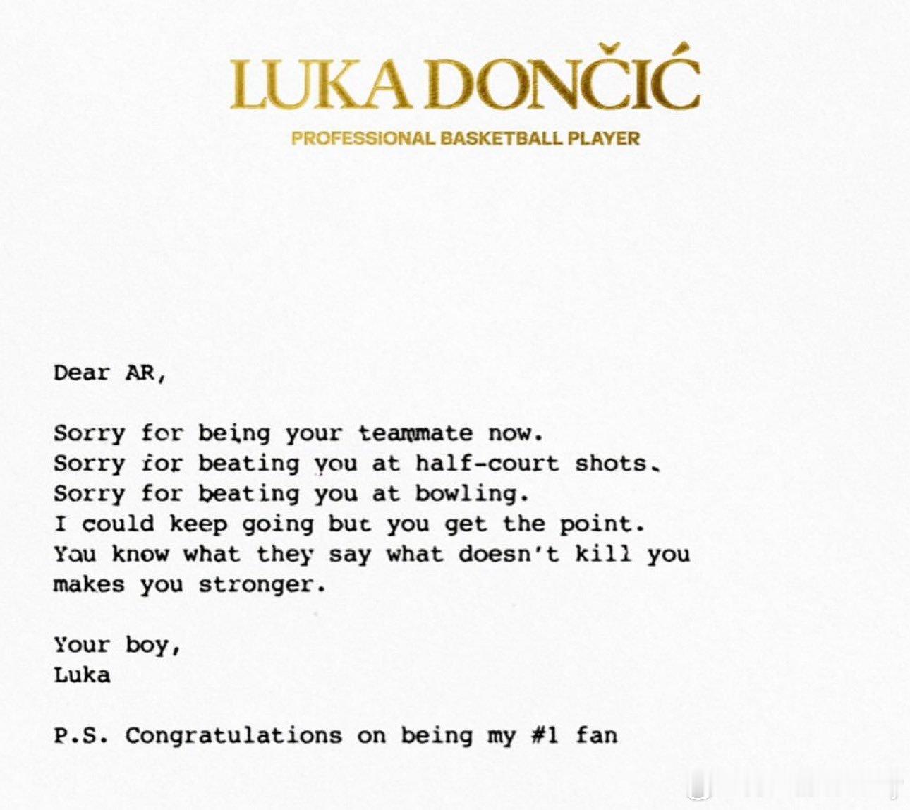 东契奇给里夫斯写了一封信😂😂😂😂亲爱的里夫斯:很抱歉现在成了你的队友。很抱歉在半场投篮上赢了你。很抱歉在打保龄球时也赢了你。我还能继续说下去,但你懂我的意思。俗话说,杀不死你的只会让你更坚强。你的男孩,卢卡P.S. 恭喜你,正式晋升为我的头号粉丝