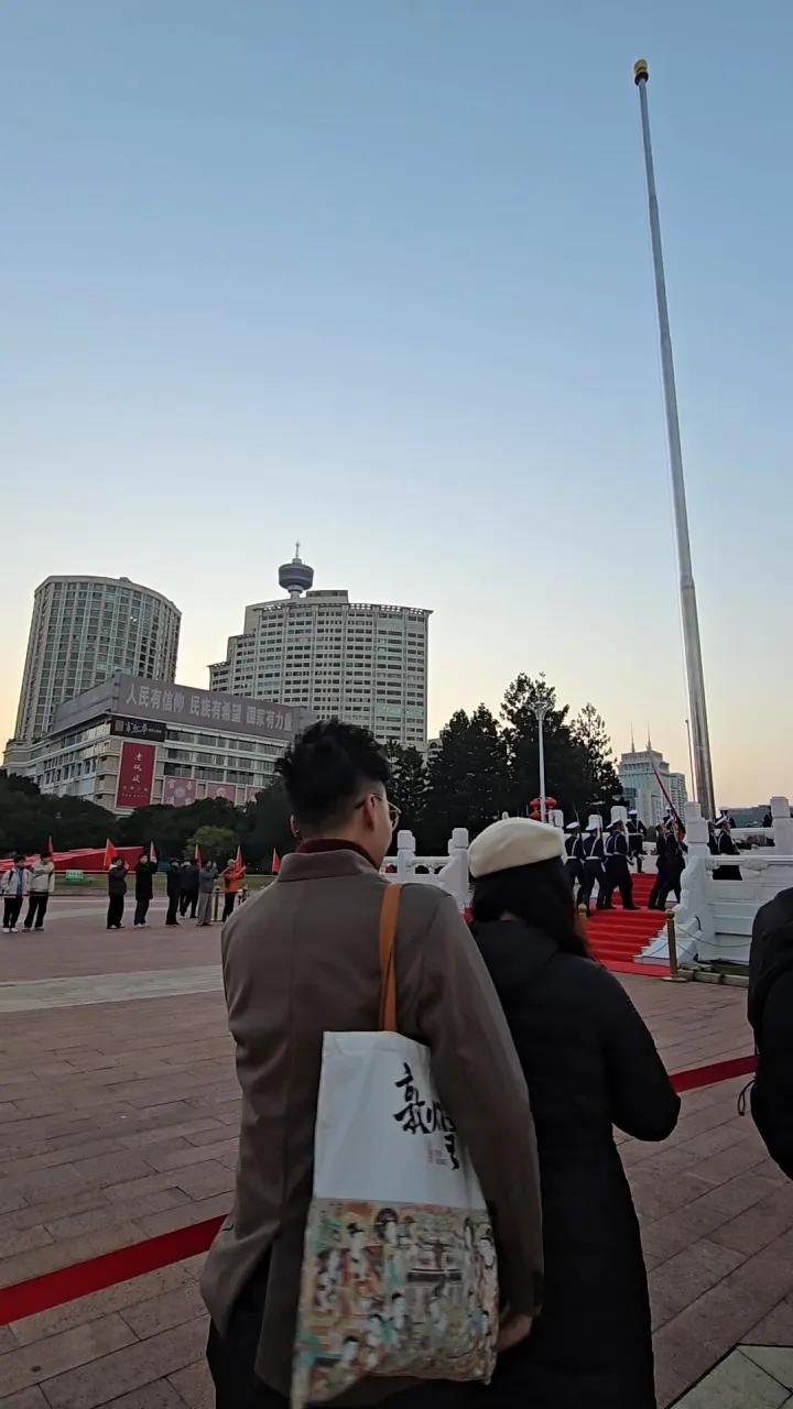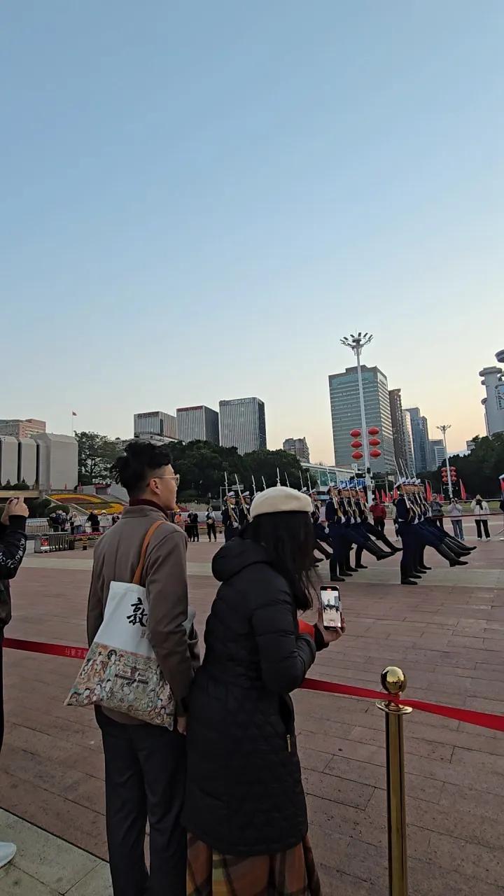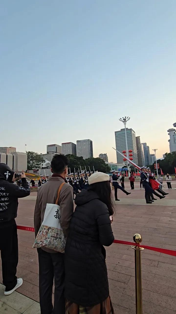 別人过圣诞 港青看升旗 福州市五一广场国旗与晨光齐升 全国有两个地方每天都有升降旗,除了北京天安门广场之外,另一个是福州。同时福州也是唯一一座由消防员担任升降国旗的城市! 今早在7度的寒冷天气下,很多朋友仍在被窝中熟睡,高sir和湾区港女在6点多已来到福州五一广场。在6时47分,当第一缕晨光穿透云层,福州五一广场上汇聚了大量的市民与游客,我们自凌晨便陆续汇聚于此,带着满腔热忱等候见证五星红旗与朝阳同升的庄严时刻。 由60名“火焰蓝”组成的国旗护卫队迈着铿锵的步伐,走向升旗区域。随着指挥员一声令下,升旗手振臂扬旗,随着雄壮的国歌声响起,鲜艳的五星红旗在晨风中冉冉升起。现场群众庄重注视国旗,齐声高唱国歌,脸上洋溢着激动和自豪。 福州市鼓楼区三坊七巷消防救援站(福州市五一广场国旗护卫队)自1991年元旦起承担福州市五一广场升降国旗任务,是全国唯一由消防救援队伍担负省会城市每日升降国旗任务的队伍。