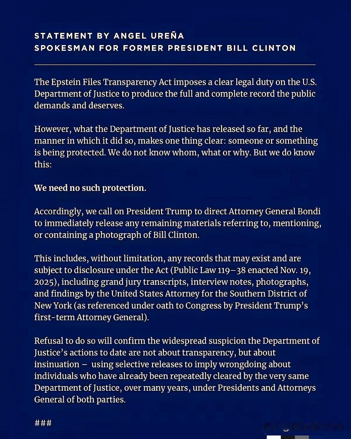 克林顿这手,玩得是真绝了。 所有人都以为他要躲,结果他直接站出来掀桌子。 指着官方的鼻子说:你们到底在保护谁?把名单全给我放出来! “我们不需要这种保护。” 品品这句话,太狠了。 12月中旬司法部公开的案宗里,别人的信息要么打码要么删减,唯独克林顿的照片高清无码,泳池嬉闹、私人飞机合影全被扒出来示众。更讽刺的是,特朗普的相关照片刚挂出来就火速下架,理由竟是“保护受害者”,这双重标准简直明晃晃地打脸。 换别人可能早就慌了,克林顿偏不按常理出牌。他不光不躲,还让发言人直接放话:“我们不需要这种保护”,要求把所有名单和材料全公开,一点都别藏着掖着。这波操作看着冒险,实则戳中了要害——你敢选择性曝光我,就得敢把所有人都拉出来晒太阳。 说白了,这根本不是简单的舆论反击,而是对美国“选择性正义”的公开叫板。爱泼斯坦案牵扯的政商名流多了去了,这么多年一直藏着掖着,如今借着公开档案搞针对性打击,无非是想找个替罪羊转移焦点。 克林顿看透了这套玩法,干脆破罐子破摔:要查就一起查,要曝光就全员曝光,别拿我当政治斗争的炮灰。这种把水搅浑的做法,反而让背后的操盘手骑虎难下,不公开就是坐实护短,公开了可能引火烧身。 其实这事儿最让人唏嘘的是,所谓的司法透明,在政治博弈面前竟成了可操纵的工具。受害者的诉求被抛在脑后,真相被黑墨遮盖,只剩下两党互相攻讦的戏码。克林顿的掀桌,与其说是为自己辩解,不如说是戳穿了那层“公平正义”的遮羞布。 各位读者你们怎么看?欢迎在评论区讨论。
