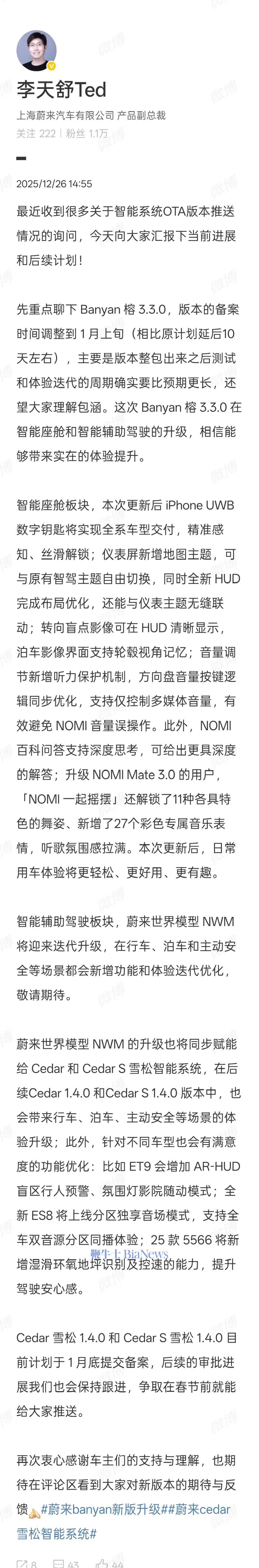 电车界12月26日消息,蔚来汽车产品副总裁李天舒今日发文,汇报关于蔚来汽车智能系统OTA版本推送情况及后续计划。