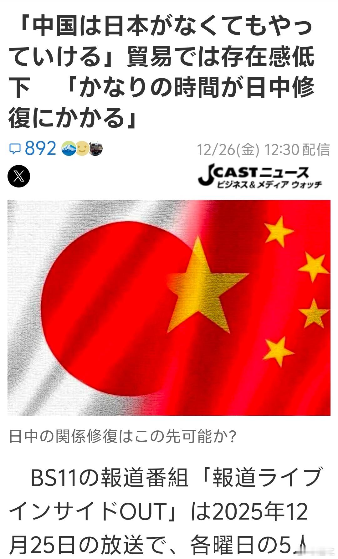 田中角荣女儿田中真纪子也出来批高市了。其实现在这个情况就是十几年来日本整体右倾化导致的,没有踩刹车的了。自民党里以前还有和中国关系好的,能说上话的,比如野中广务、加藤泓一、二阶俊博,现在是不右拿不到钱和选票。河野老爹本来是受到中国尊重的,毕竟河野讲话还是可以的。结果这家伙现在也是要去台湾拜码头,显示自己右派的一面。所以BS11这边说了半天,日本其实除了公明党还能说上话外,日本自己执政党都是右派了,想找个缓和商量出路的都没了。中日贸易对于中国来说是5%,对于日本来说是20%。所以日本电视节目才有中国不需要日本的这种议论吧。