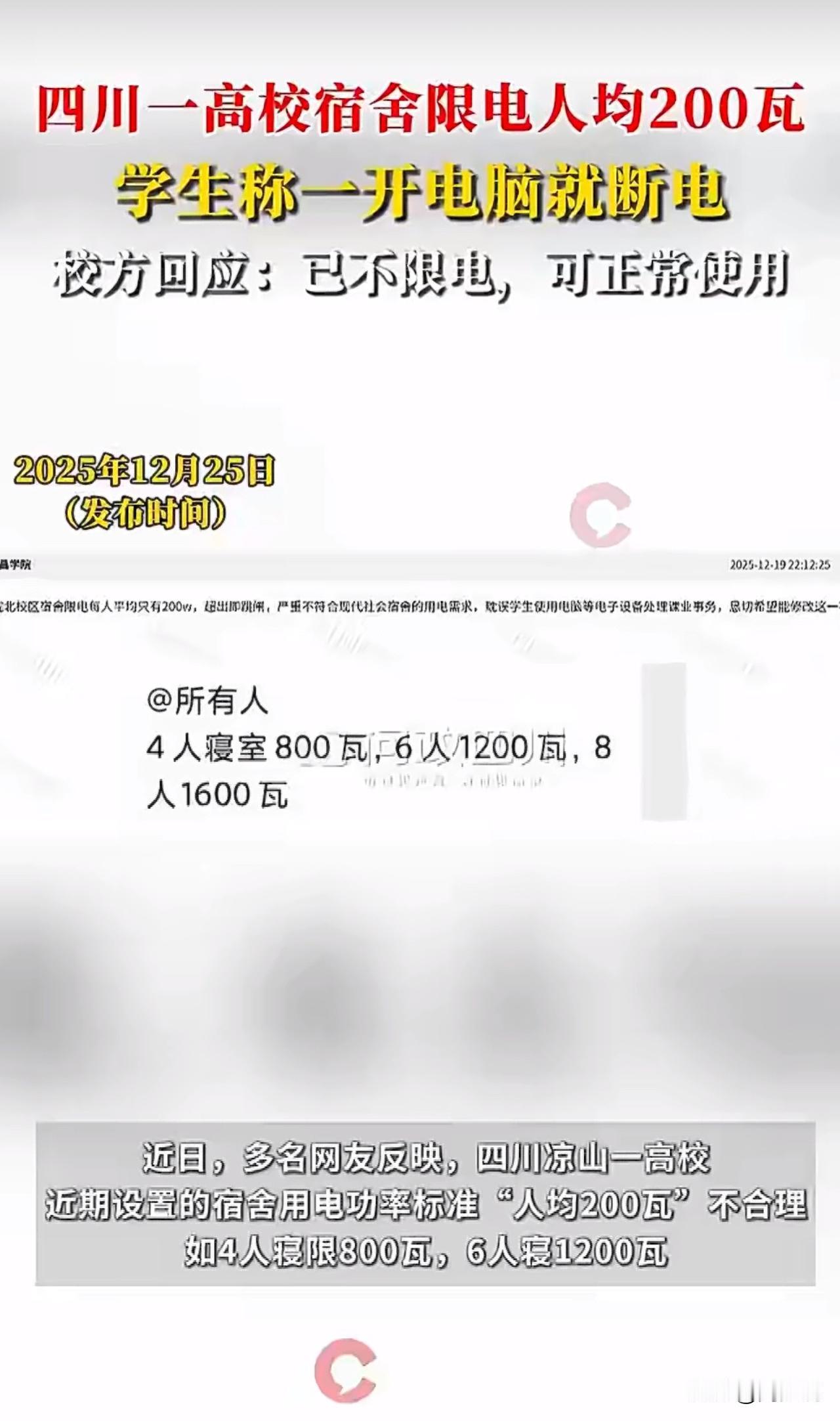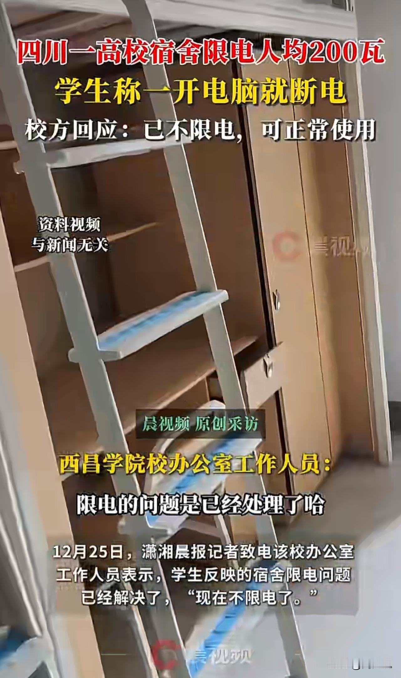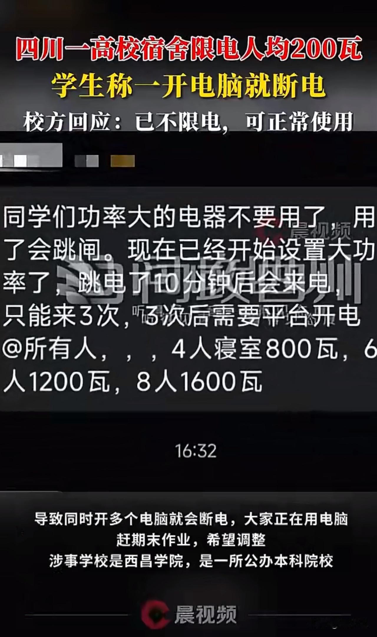 “宿舍电脑一开机就断电?”四川西昌,一所公办本科院校的学生吐槽:4人寝总功率只给800瓦,人均200瓦,多开几台电脑就跳闸,期末赶作业都成了“抢电大战”。消息一出,网友吵翻了:有人说学校太抠门,有人却说,安全第一,这点电够了。 此事情发生在四川西昌学院。有学生在网上晒出聊天记录,称学校给宿舍设置了用电上限:4人寝800瓦,6人寝1200瓦,一旦超功率就自动断电。 这意味着几台电脑一开机,再加上一个热水壶或者吹风机,基本就“爆表”。期末临近,大家都在赶论文、做PPT,结果写着写着,电脑一黑,又断电了。有人只能轮流充电,有人干脆去自习室蹭电,吐槽“学习被电卡脖子”。 学生们把情况发到网上后,很快引起关注。有媒体联系学校办公室,工作人员回应:现在已经不限电了,可以正常用电。后勤部门也表示,学生宿舍目前不再执行之前的功率限制。 此事引发众多网友议论纷纷。有网友说:“学校初衷可能是为了安全,但限得太死,连正常学习用电都受影响,就有点本末倒置了。大学本来就是学习的地方,不能让学生为了用电脑写作业,还要算着瓦数过日子。” 也有网友认为:“很多宿舍火灾都是大功率电器引起的,学校限电可以理解。关键是要在安全和需求之间找平衡,比如统一排查线路、更换设备,而不是简单粗暴一刀切。” 还有人指出:“现在的大学生,电脑、平板、手机、路由器、台灯,用电需求和十年前完全不一样了。学校管理如果还停留在能亮灯就行的思维,肯定会和学生产生矛盾。” 这事在周少看来,一方面,高校需要守住“安全底线”,防止因私拉乱接、违规电器引发火灾,这是对学生生命负责;另一方面,高校更要保障“学习底线”,不能让不合理的管理方式,变成学生正常学习的阻碍。 大学不只是提供一张床和一间教室,更应该提供基本而体面的学习生活条件。用电管理可以有,但方式要更精细。 比如通过智能电表实时监测、对违规电器精准识别,而不是简单给一个“人均200瓦”的硬性上限;可以通过宿舍电路改造、增加用电容量,在安全前提下满足学生合理需求。 当然,该校目前已经不限电了,可以正常用电。也是切切实实听取了学生意见,这是好事情。毕竟,学生来大学是为了读书和成长,而不是为了每天算着瓦数生活。#寻美三湘# #长沙新朋友#