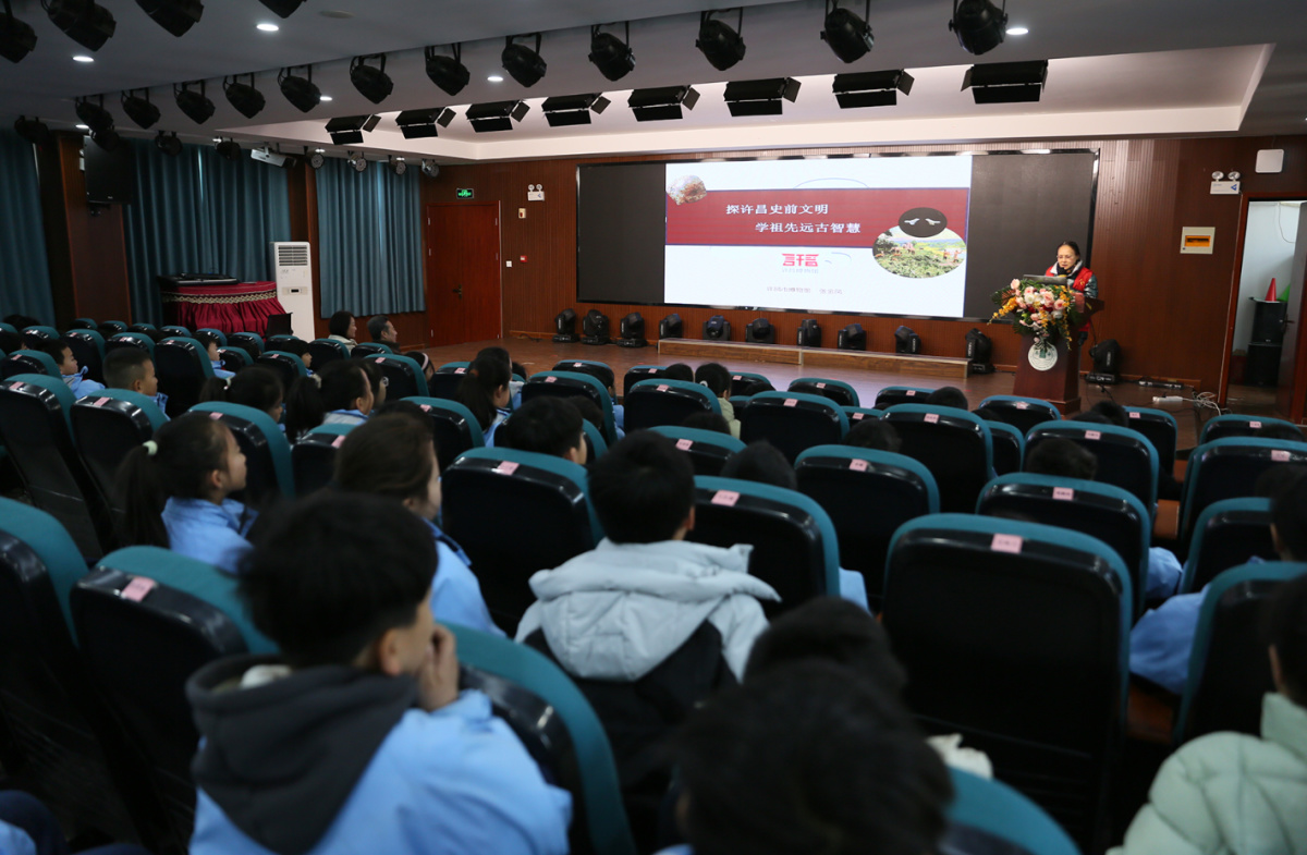 随后,一场关于“许昌早期人类文明的起源和中华文明特点”的文博知识小课堂在南海街小学4楼会议厅开课了。同学们有的凝神静听,有的趴在前排的座椅上,仔细了解早期人类是从哪里来的,古人类头骨化石“许昌人”又是如何被发掘出来的。
