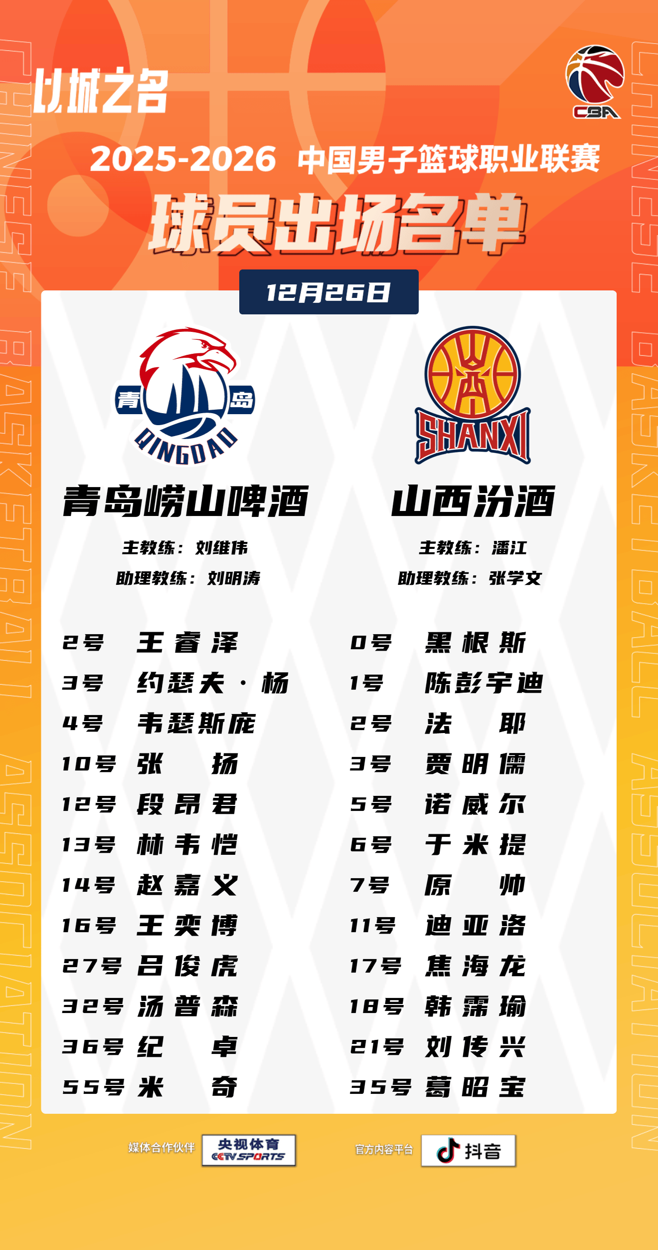 虎扑12月26日讯今日CBA常规赛,青岛对阵山西的大名单已经公布。