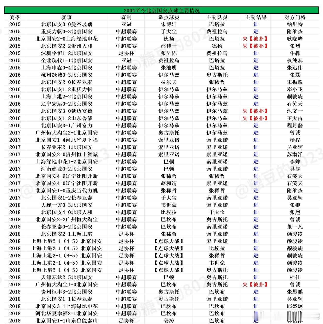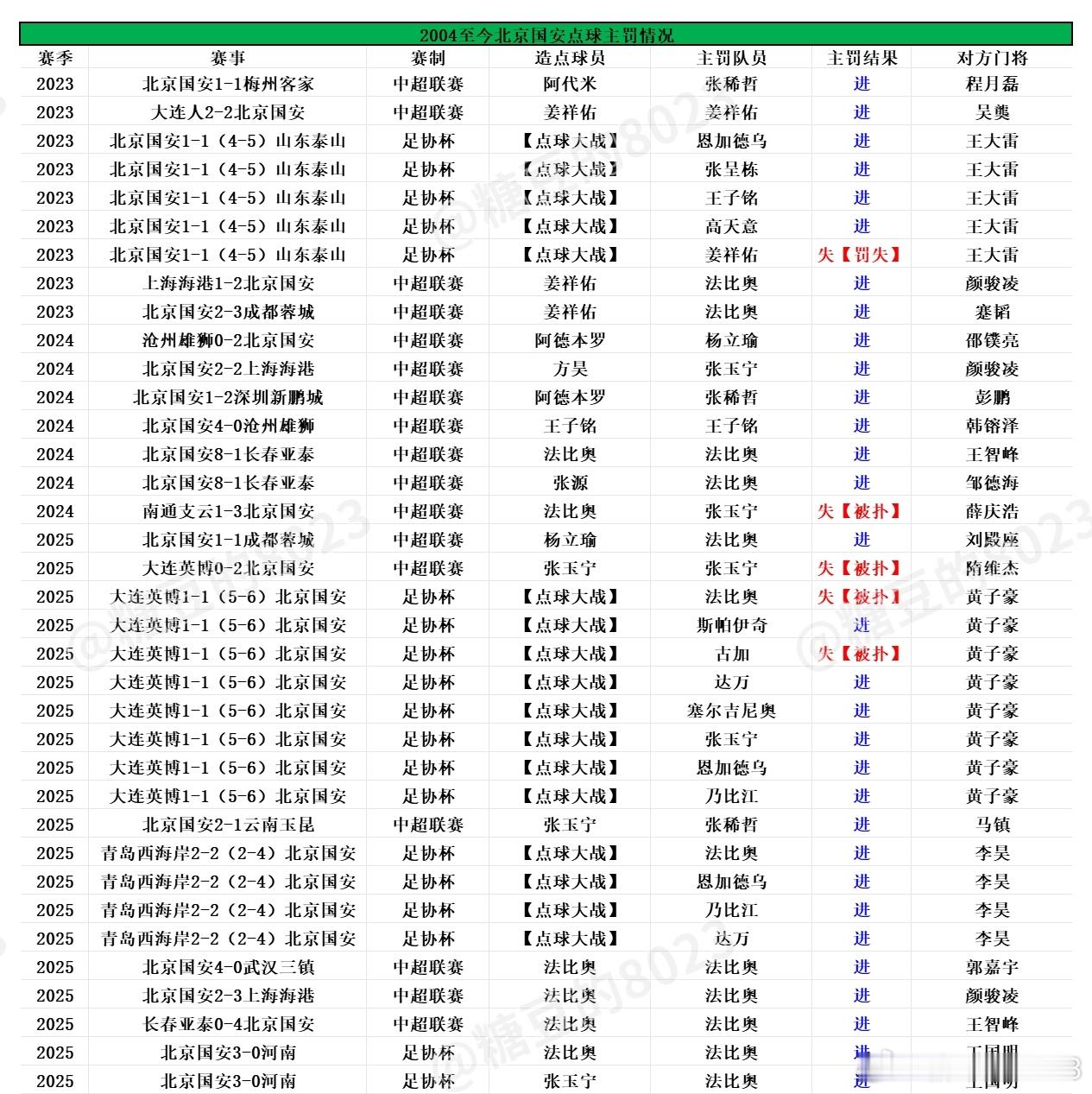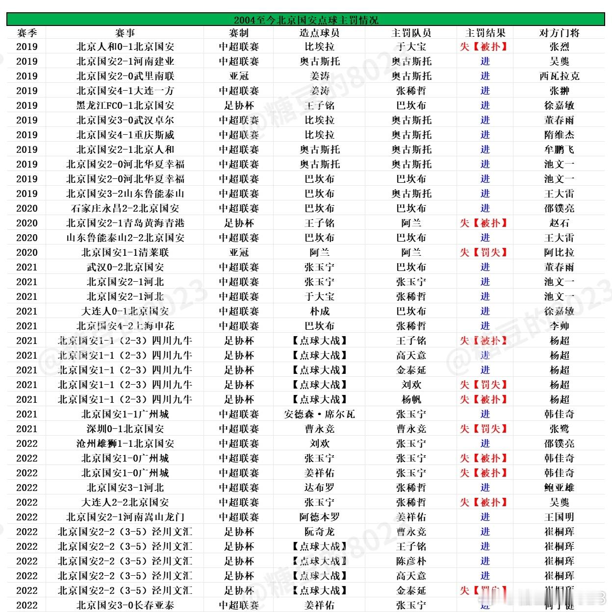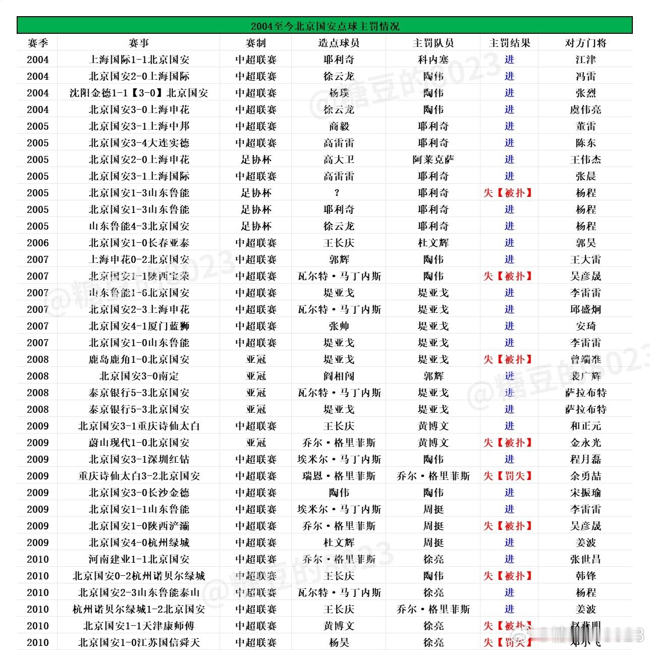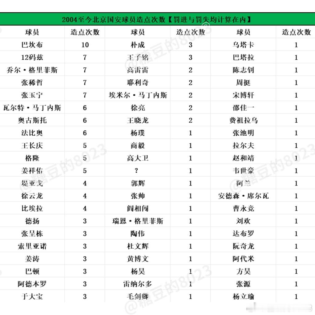 北京国安赛季末大盘点⑦📊国安球员点球命中率+造点次数一览:索9、巴坎布点球全中,张稀哲、法比奥超高命中率,“12码兹”一年造7点!【图3】📊国安球员点球命中率一览【图4】📊国安球员造点球次数一览【点球主罚情况】【图5】📊2004赛季-2010赛季【图6】📊2011赛季-2014赛季【图7】📊2015赛季-2018赛季【图8】📊2019赛季-2022赛季【图9】📊2023赛季-2025赛季注:1️⃣ 本贴从2004赛季开始统计。2️⃣ 点球命中率的计算包含点球大战。3️⃣ 无论点球罚进与否,都算“造点+1”。4⃣️ 数据截至2025赛季结束。