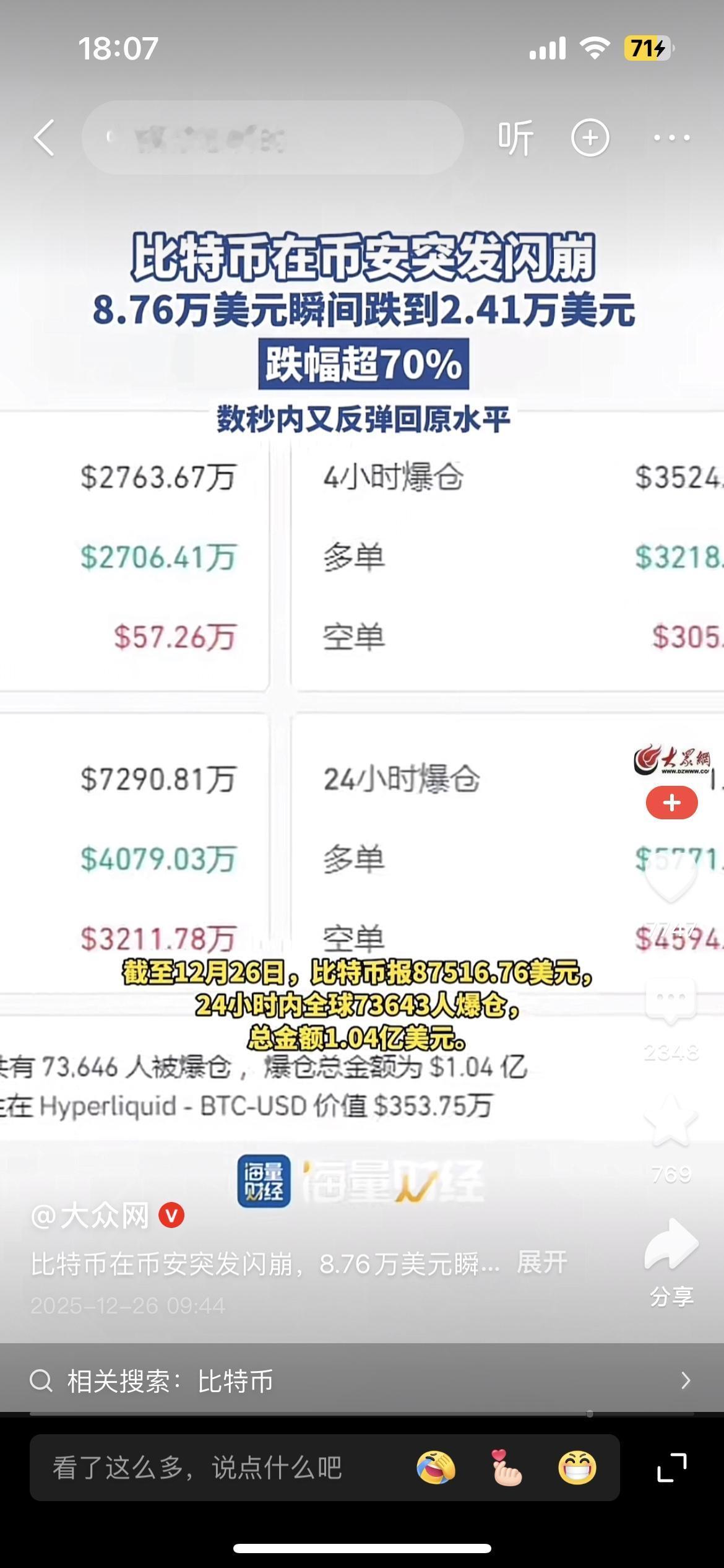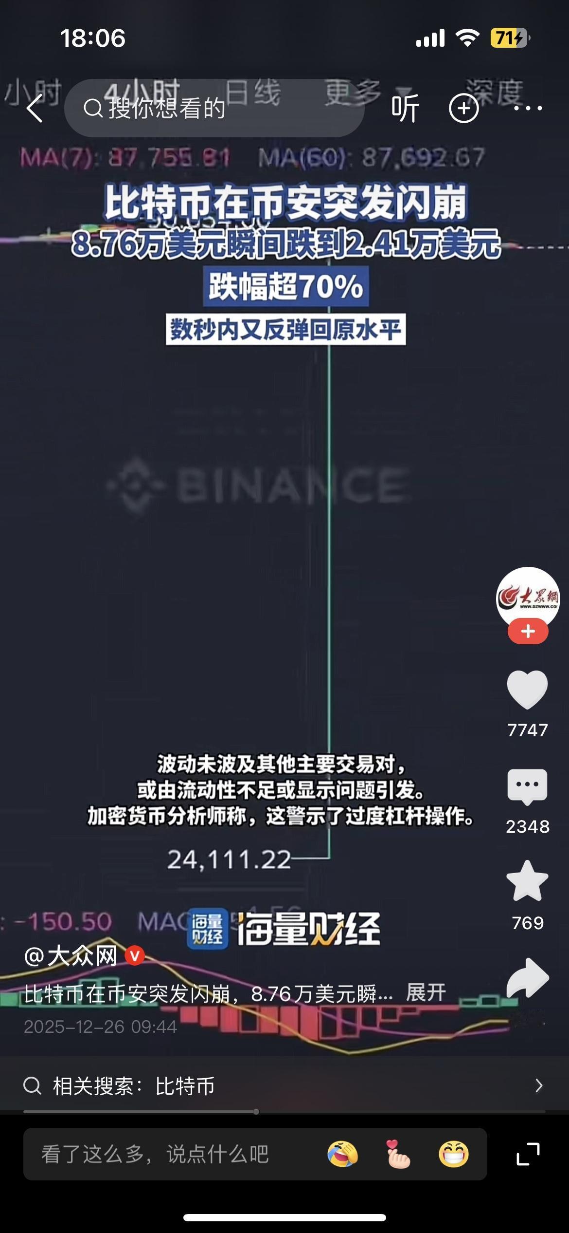 比特币70%的“闪崩”跌幅,如果没有在数秒内恢复原位置,估计又得数以万计的人排队上天台了! 比特币发生“闪崩”,从8.76万美元/枚瞬间跌倒2.41万美元/枚,跌幅超过70%,但是又在数秒内反弹回原水平! 这超过70%的跌幅用“心惊肉跳”不足以形容了,这也多亏在数秒内反弹回原水平,否则估计又得数以万计的人要排队上天台了! 比特币能够如此大幅度的跌幅又在数秒内恢复到原位置,比特币的价值几许?真的需要打个问号。 国内禁止比特币交易是多么正确的!要不然这韭菜割起来可不是简单的“割韭菜”!而是要把韭菜根都要拔起来!