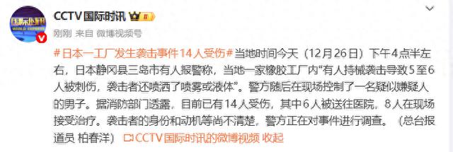 据@CCTV国际时讯,当地时间今天(12月26日)下午4点半左右,日本静冈县三岛市有人报警称,当地一家橡胶工厂内“有人持械袭击导致5至6人被刺伤,袭击者还喷洒了喷雾或液体”。