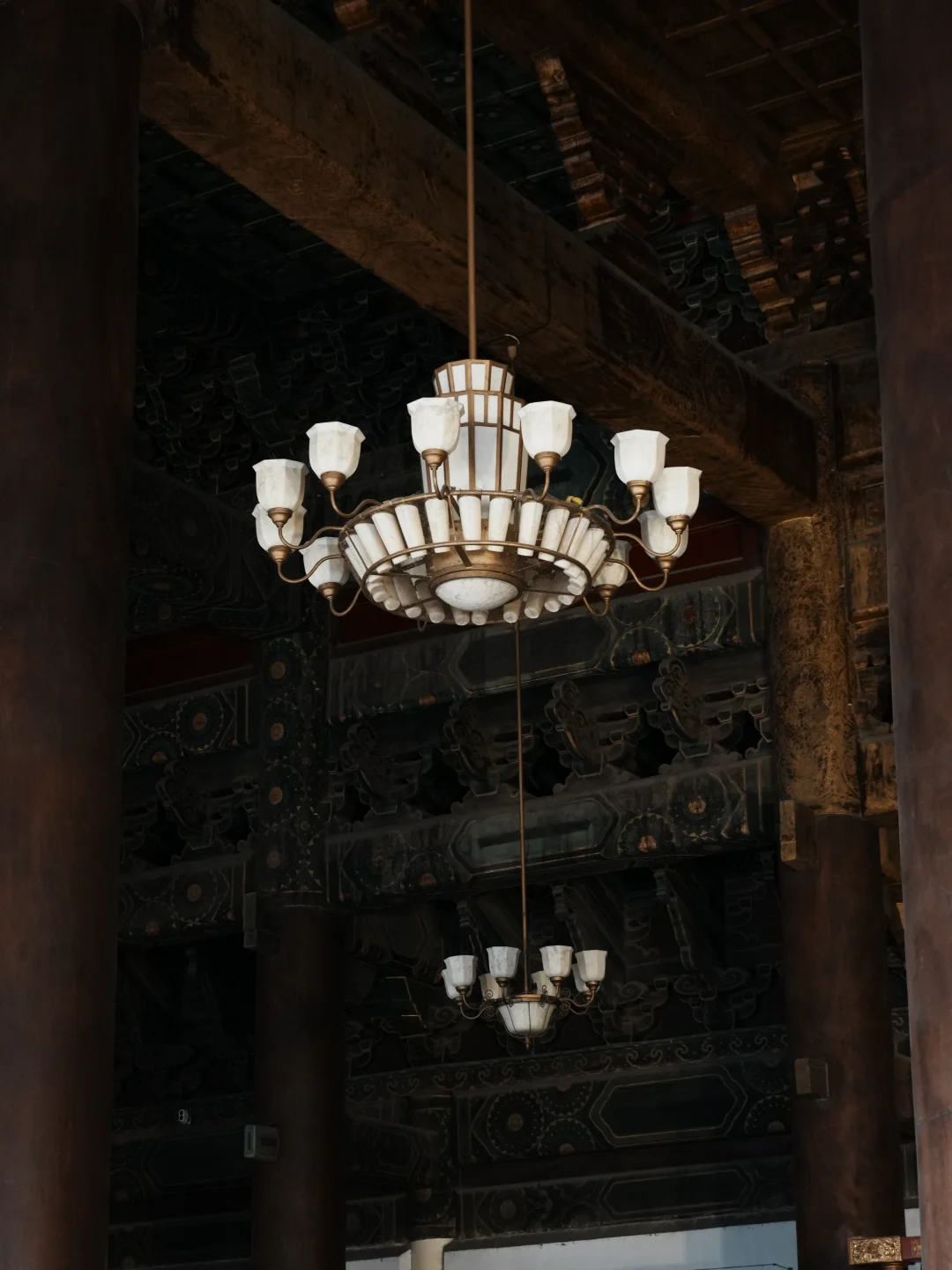 ✨金丝楠木: 68根600年不腐不蛀金丝楠木🪵中间3间梁架通体贴金✨单根楠木柱的价值都无法估量