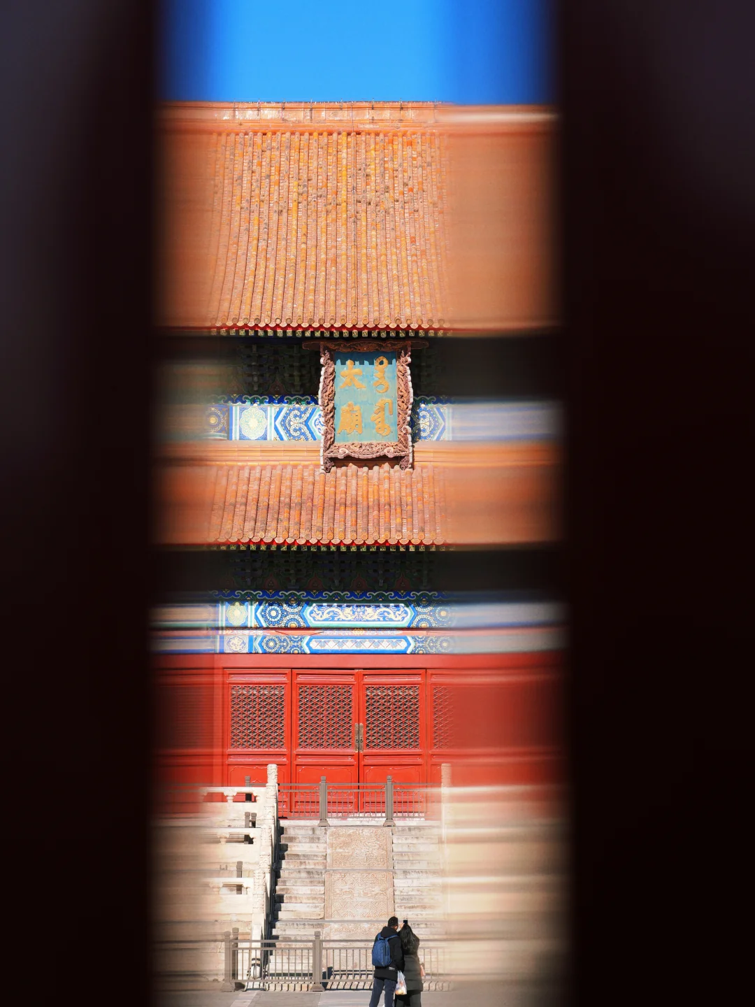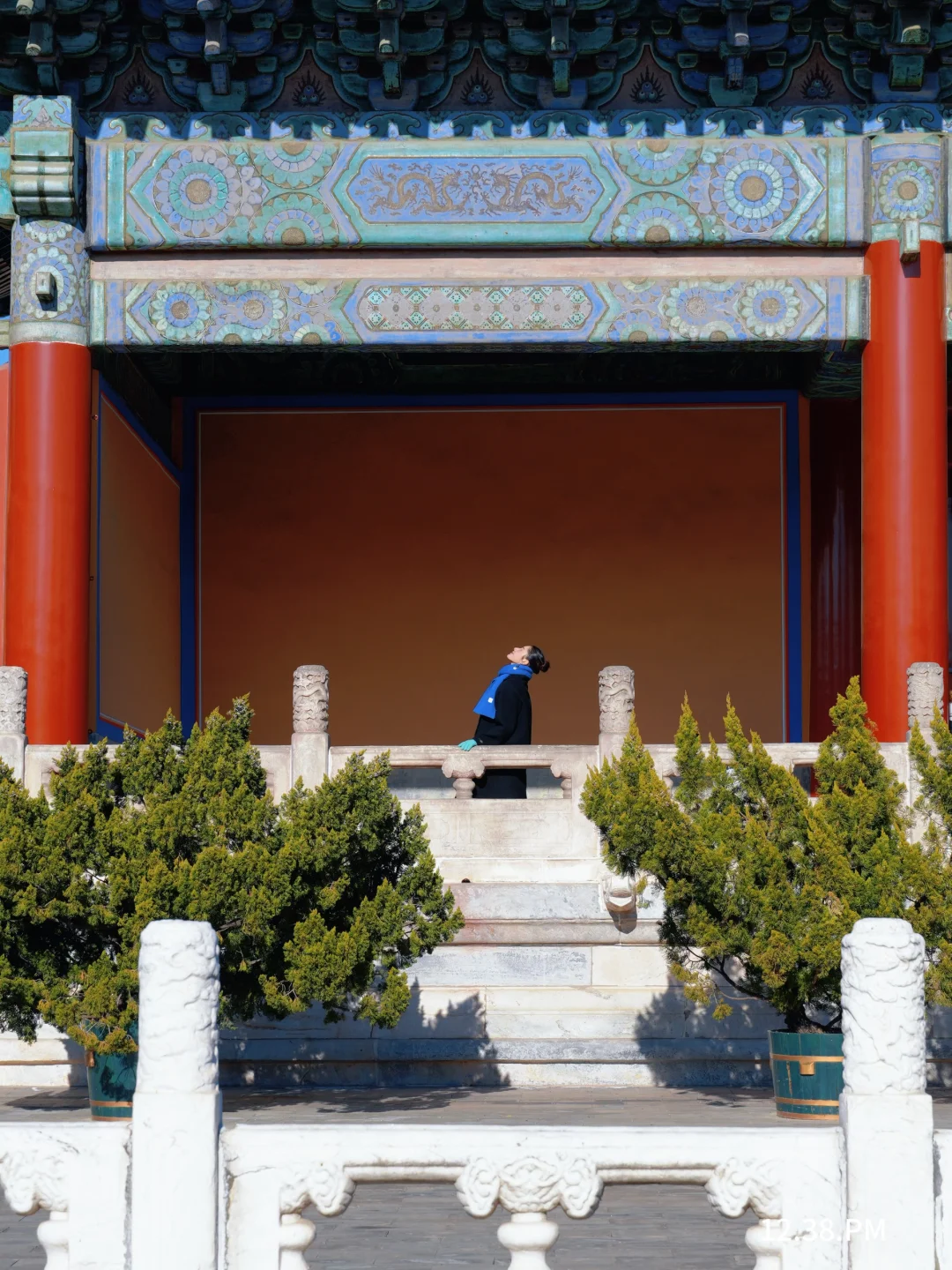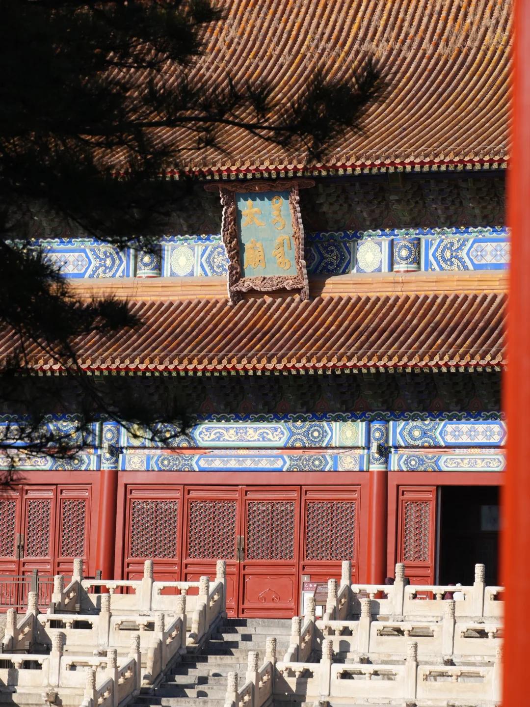 ▪️三层汉白玉台阶/西侧栏杆,低角度仰拍,红墙金瓦+蓝天