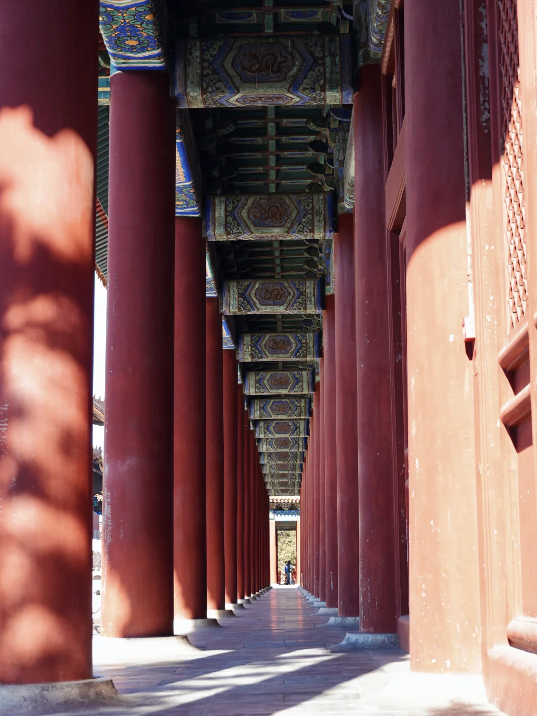 东门进➠五色琉璃门➠戟门➠享殿➠寝殿➠祧庙➠太子林➠西北门出,到故宫全程不走回头路