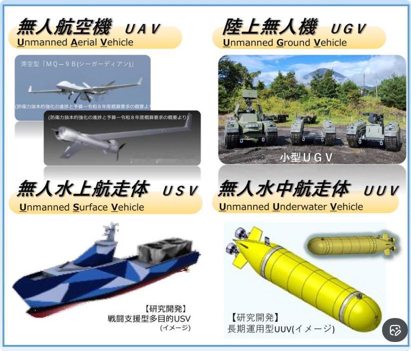 小日子一直在偷偷的武装自卫队,这两张照片分别展示的是岸防系统和海陆空无人作战武器