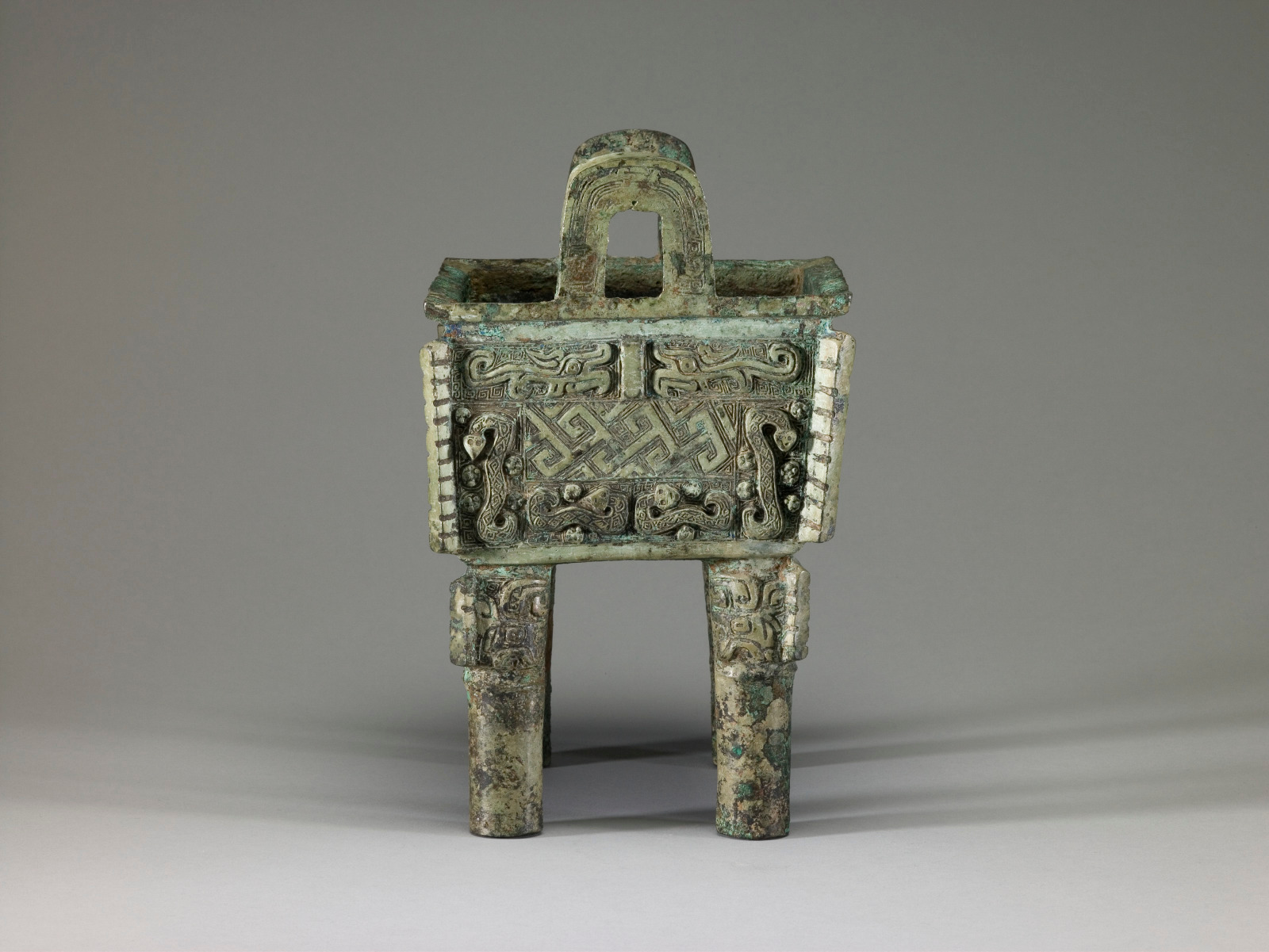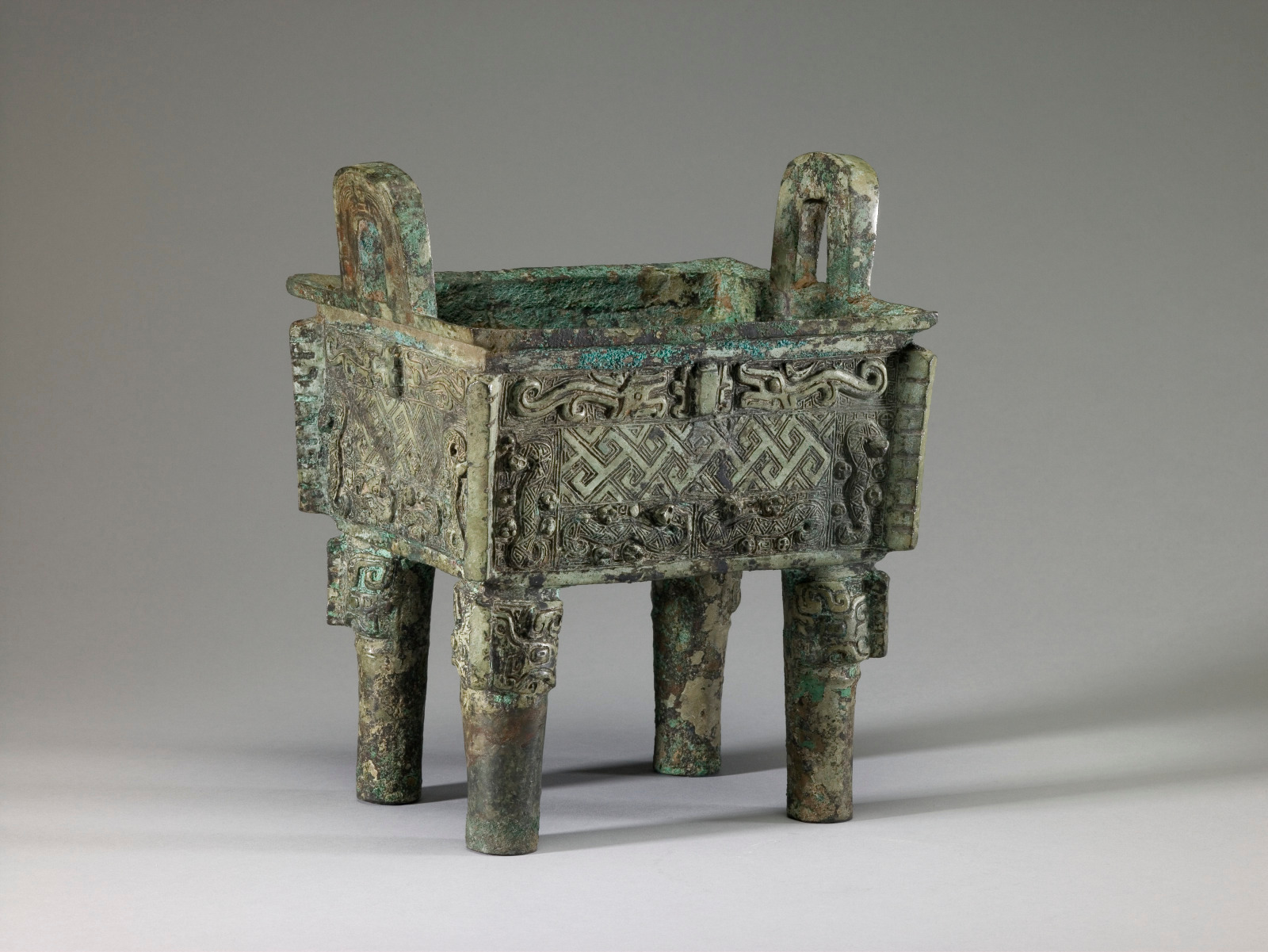 美国圣路易斯美术馆藏商晚期:"鼎"方鼎,曲折雷纹龙纹肥遗纹