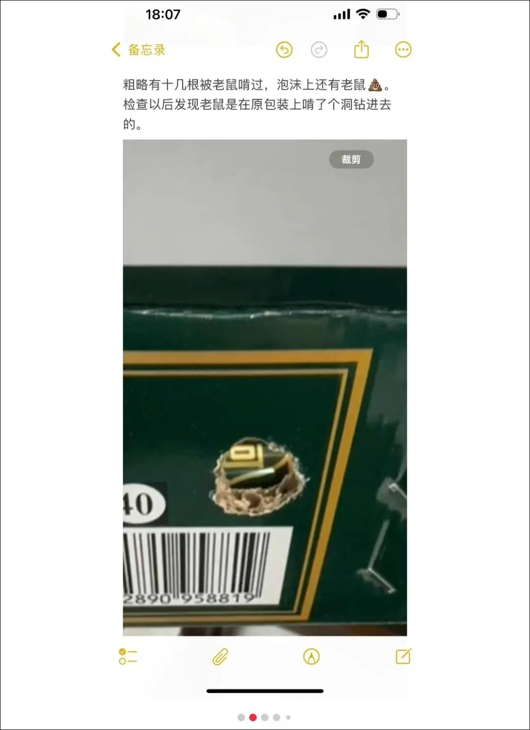 起初,顾先生没有发现箱内食品存在问题,打开一箱取出一根食用后,顾先生的姐姐发现其中很多香肠有疑似被老鼠啃食的痕迹。随后,顾先生检查了包装,发现产品纸箱上存在孔洞。顾先生猜测,老鼠是啃咬纸箱进入箱中的。