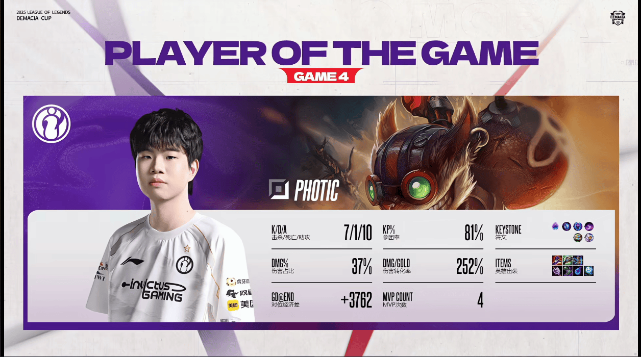 虎扑12月26日讯在刚刚结束的IG对阵TES的BO5比赛中,Photic炸弹人打出7/1/10战绩,斩获IG对阵TES第四局MVP