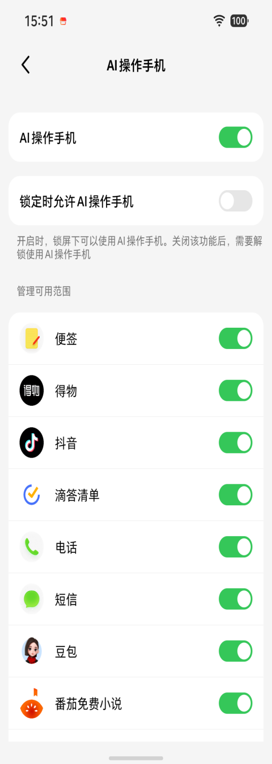 具体而言,事前授权阶段,即用户首次打开应用时将弹窗提示操作及权限使用场景。每次执行具体功能前,系统会在对话框询问用户,并提供"单次允许""始终允许""拒绝"三种选项。锁屏状态下唤醒助手则需通过人脸、声纹或密码鉴权,防止未经授权的访问。此外各个App均有单独开关,可独立控制是否使用AI操作手机。