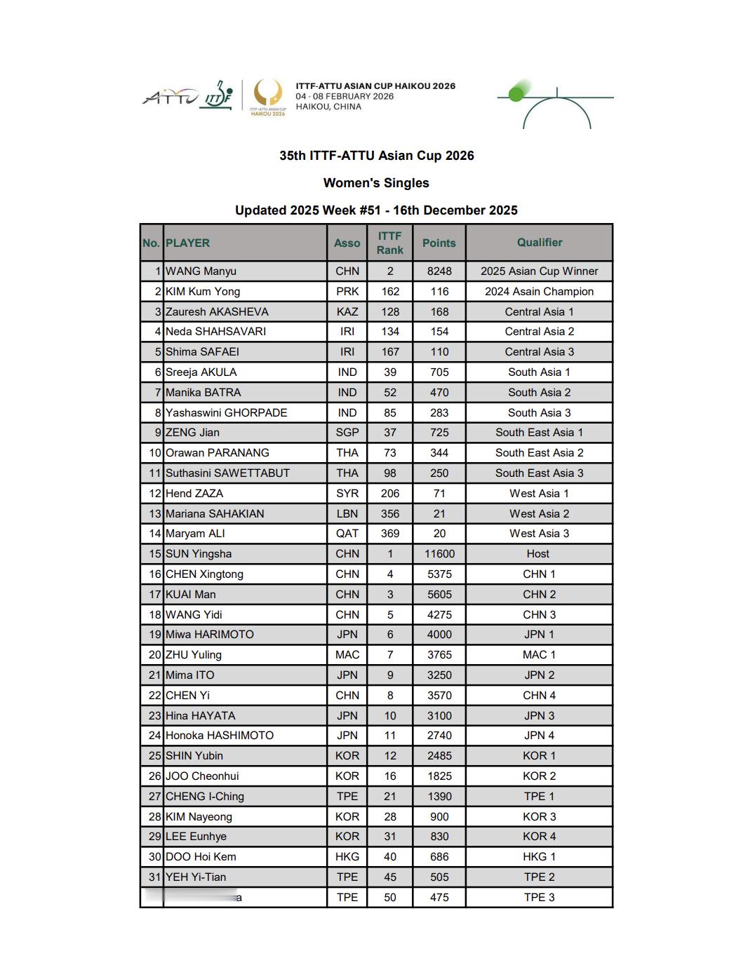 第35届国际乒联-亚乒联盟亚洲杯丨邀请名单*最终参赛以实际报名为准