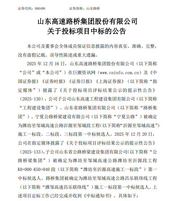 12月26日,山东路桥(000498.SZ)公告称,公司子公司在潍坊至邹城高速公路沂源至邹城段工程等项目中标,中标价合计约94.02亿元,占公司2024年度经审计营业收入的13.18%。若项目顺利实施,将对公司经营业绩产生积极影响。上述项目施工期均为1095日历天,公司将在施工工期内按照施工进度确认收入。本项目招标方山高基建公司为本公司控股股东山东高速集团有限公司的全资子公司,为本公司关联方。本项目所涉关联交易事项已经公司2025年第一次临时股东大会、2025年第三次临时股东会审议通过。