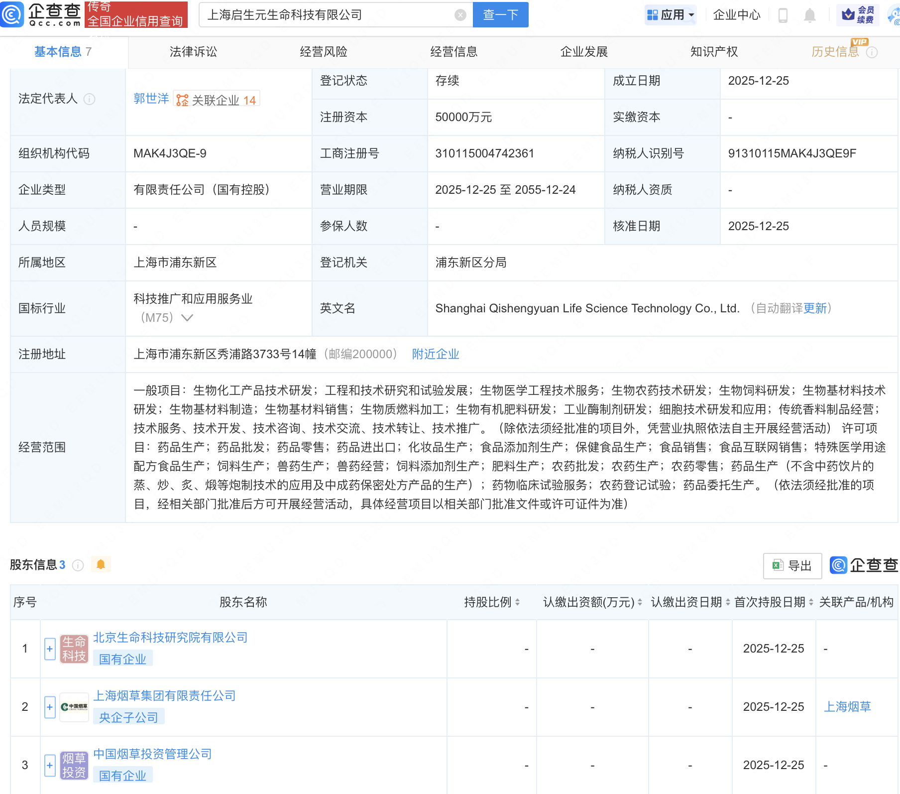 企查查APP显示,近日,上海启生元生命科技有限公司成立,注册资本5亿元,经营范围包含:生物医学工程技术服务;生物农药技术研发;生物饲料研发;生物基材料技术研发;生物基材料制造等。企查查股权穿透显示,该公司由上海烟草集团有限责任公司、中国烟草投资管理公司、中国烟草总公司旗下北京生命科技研究院有限公司共同持股。