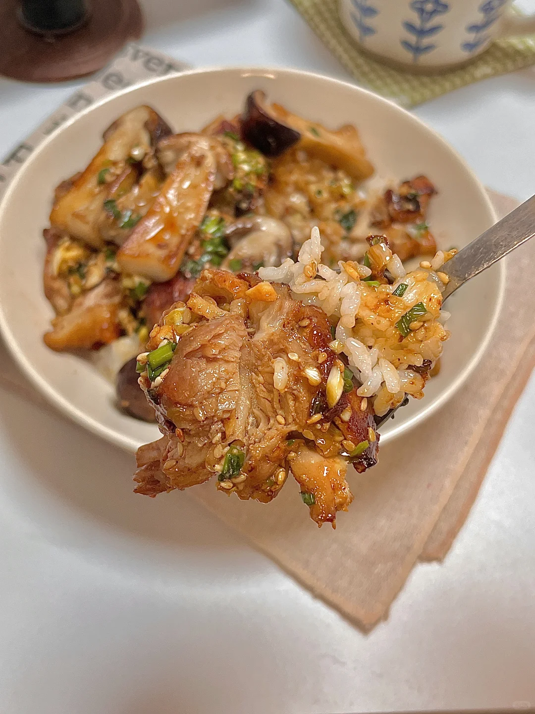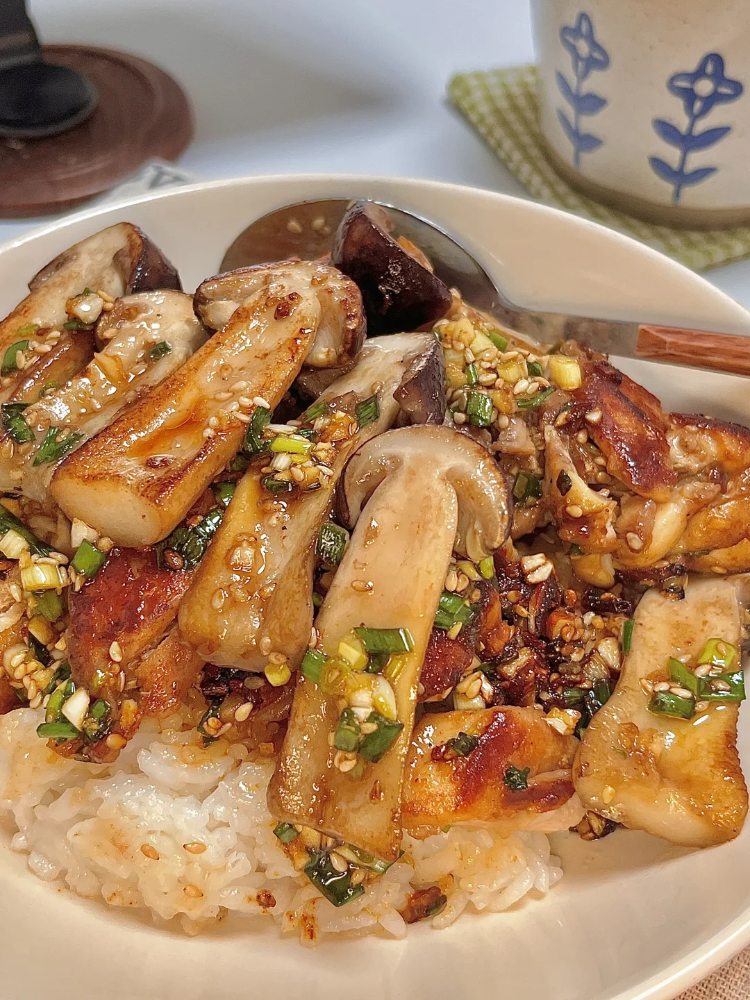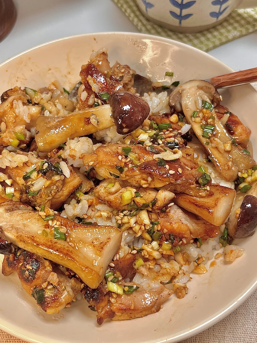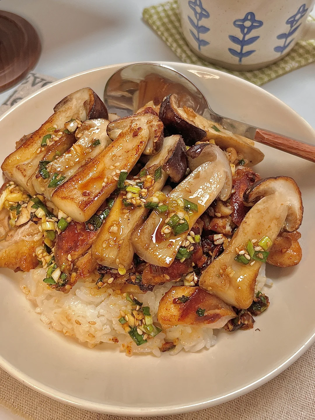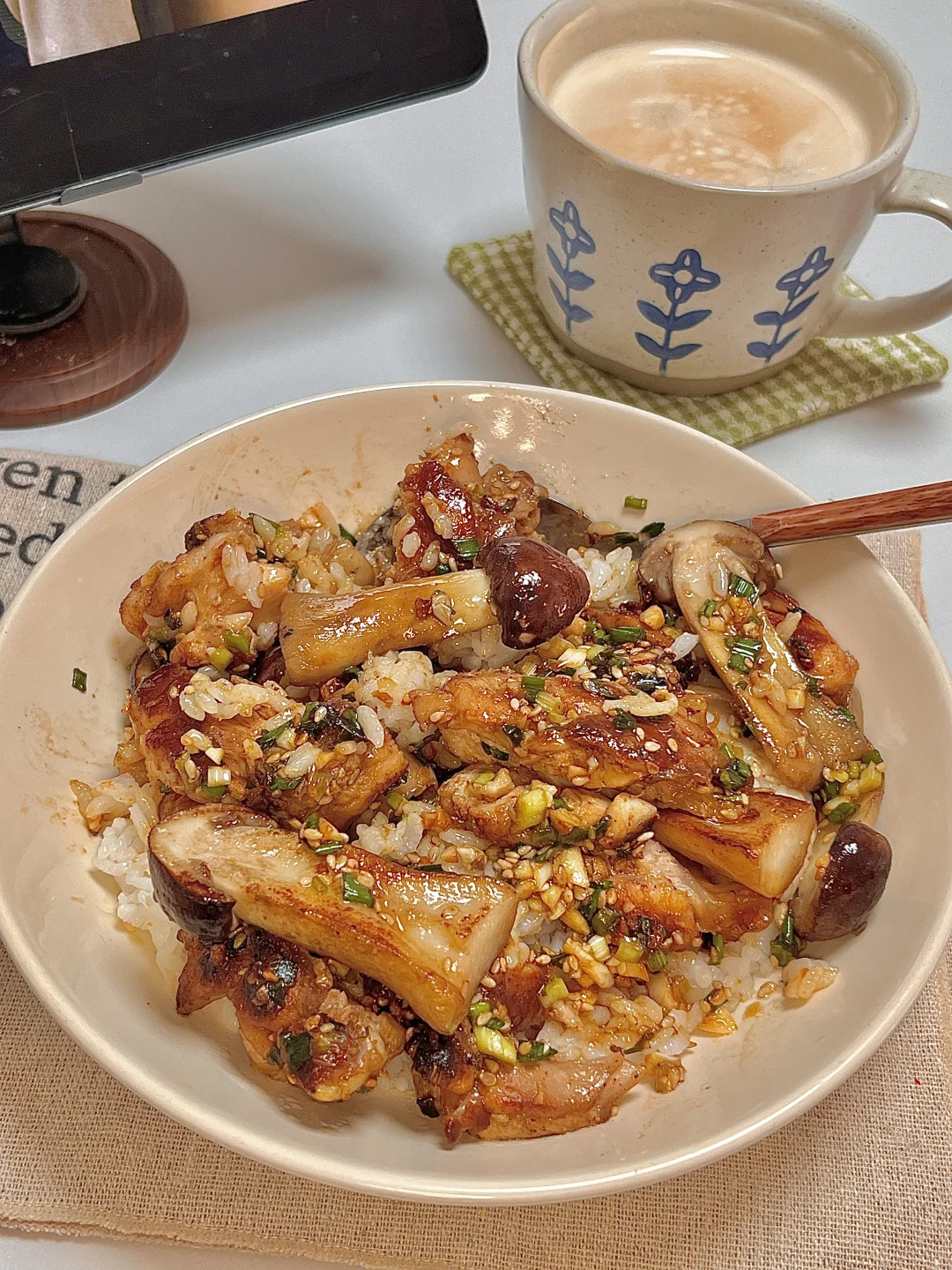🍴今日份一人食: 盐葱酱松茸鸡腿饭 拿铁 . 这碗太幸福了,鲜到掉眉毛啦!鸡腿肉煎的焦焦的,撒上多多的盐葱酱,配着菌菇的鲜 味道巨香浓😋巨下饭🍚每一口都超满足的!一段时间不吃都会想念的程度啦! 爱吃的宝一定要去试试呀✌🏻