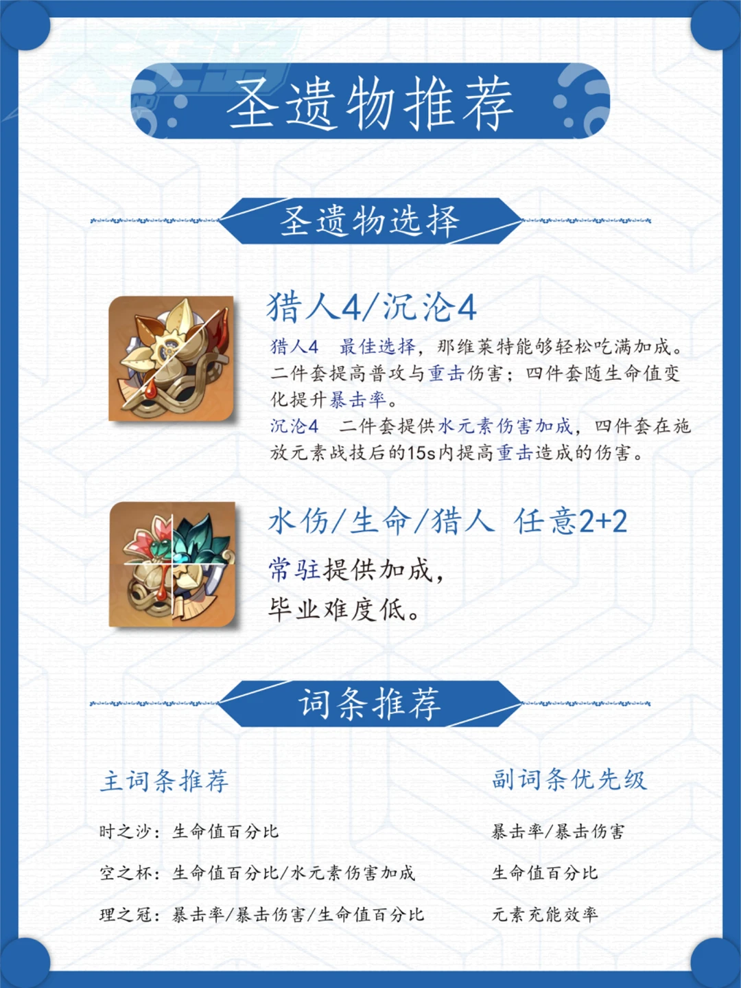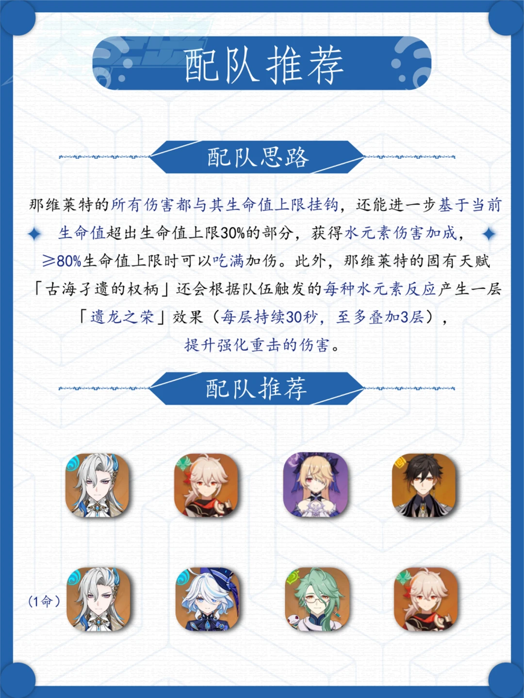 那维莱特复刻啦[飞吻R] 那维莱特的超详细攻略来啦! 建议收藏,教你超强水c是怎样练成的 配队方面还可以选择: 那维莱特+万叶+菲谢尔+钟离/夏洛蒂。 那维莱特+琴+芙宁娜+钟离 那维莱特+万叶+迪希雅+纳西妲 1命那维莱特+万叶+芙宁娜+白术/夏洛蒂 1命那维莱特+万叶+芙宁娜+香菱 本攻略由天空岛攻略组原创,未经许可,请勿转载